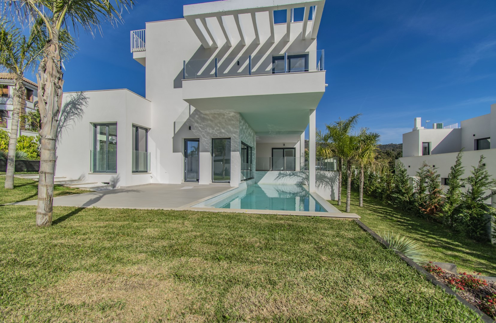 Elegant contemporary style villa, located in the exclusive area of Sotogrande, in a quiet area next to the golf courses just a few minutes drive from the port, the beach and all services.