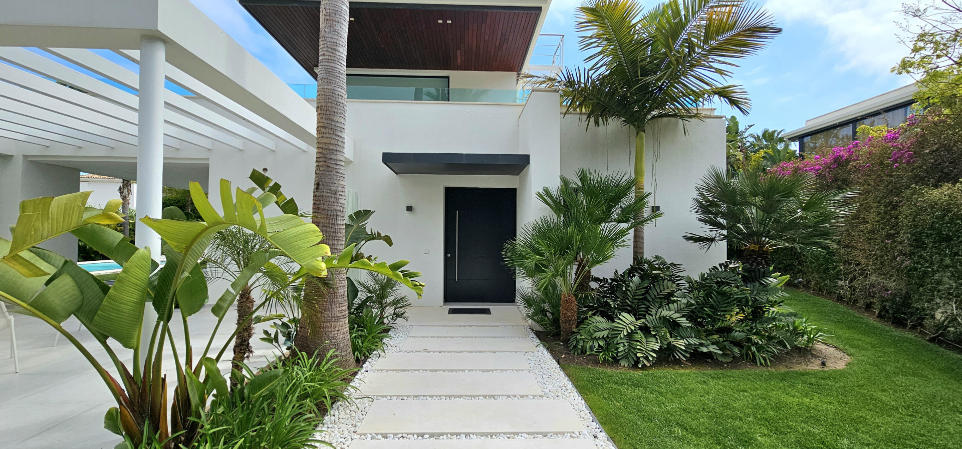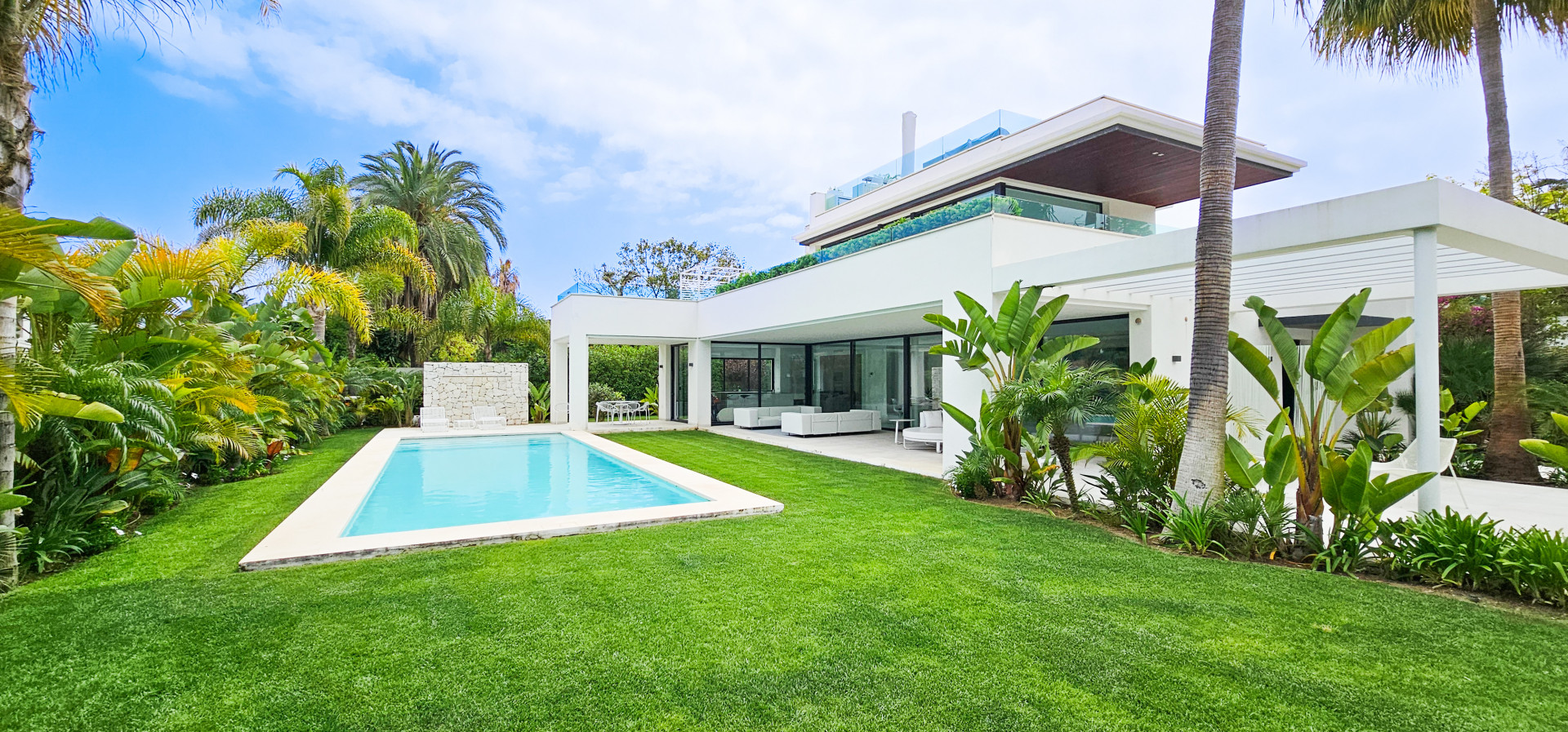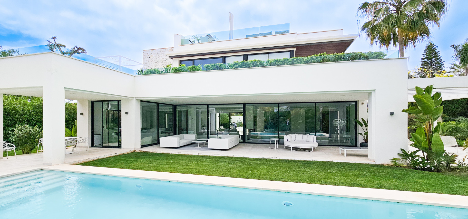 Entdecken Sie diese prächtige Villa mit ultramodernem Design in idealer Lage, nur 100 Meter vom Meer entfernt, im prestigeträchtigen Stadtteil Casasola. Diese zeitgenössische Residenz, die von einem der renommiertesten Architekturbüros der Costa del Sol entworfen wurde, bietet ein außergewöhnliches Lebensumfeld.
