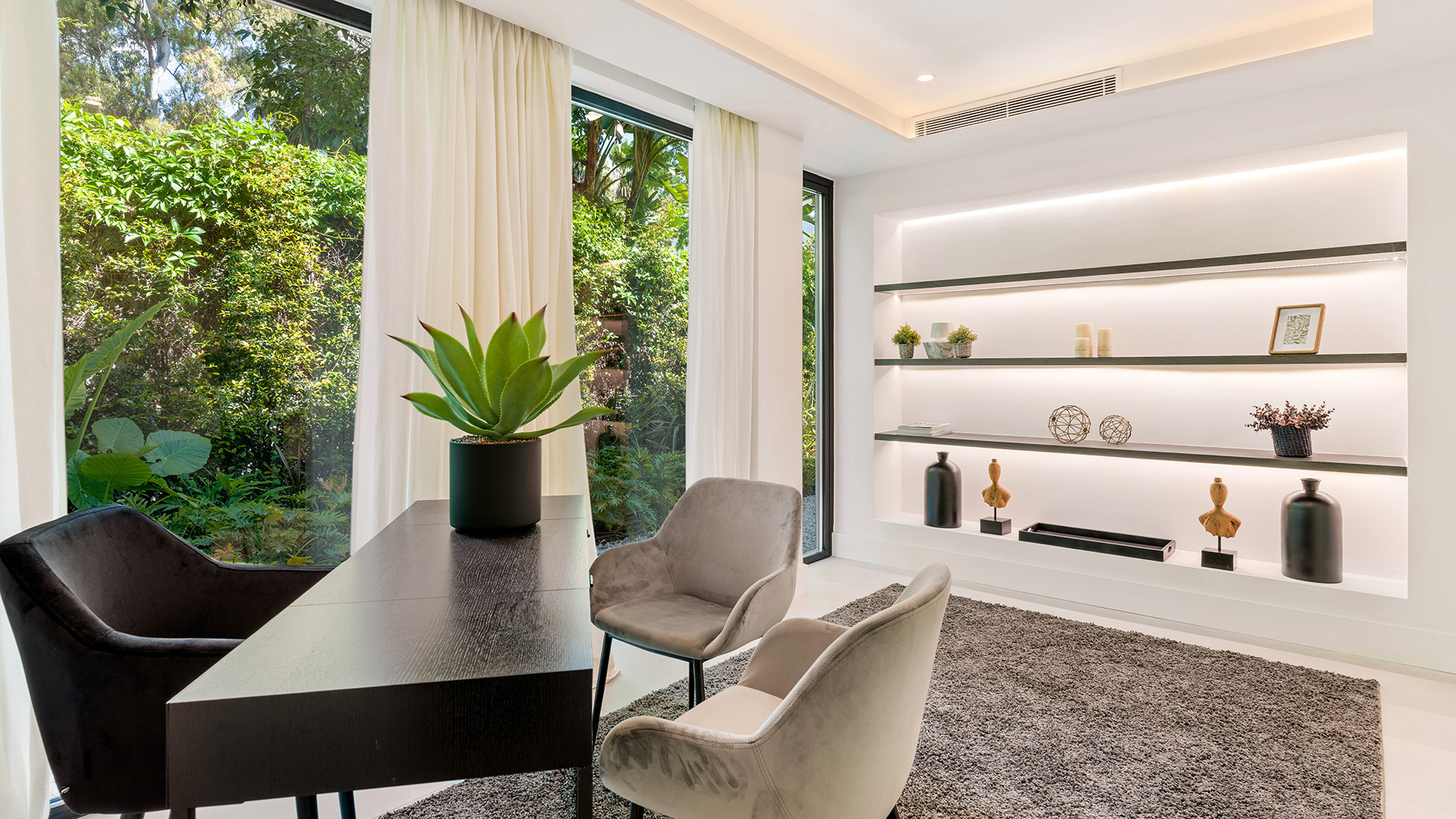 Das Haus verfügt über ein gut ausgestattetes Büro, eine geräumige und gemütliche Küche und ein großes Wohn-Esszimmer mit direktem Zugang zur Terrasse im Erdgeschoss. Große Fenster bieten einen faszinierenden Blick auf den Garten und den Swimmingpool.
