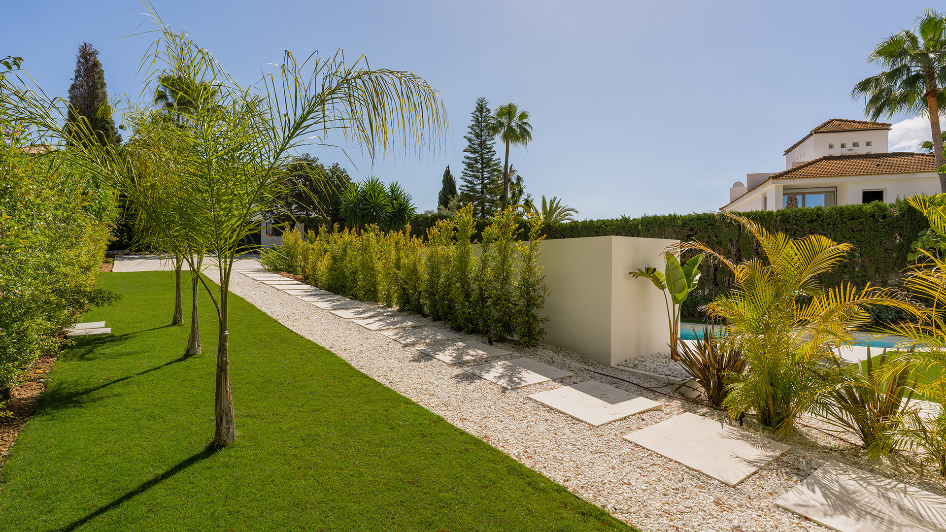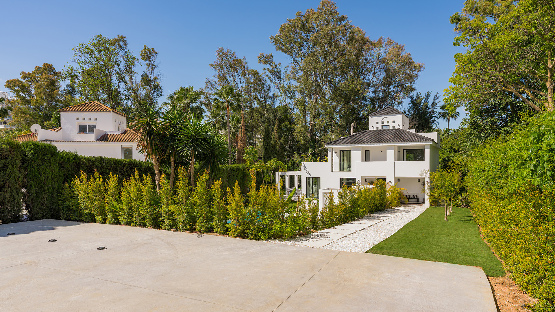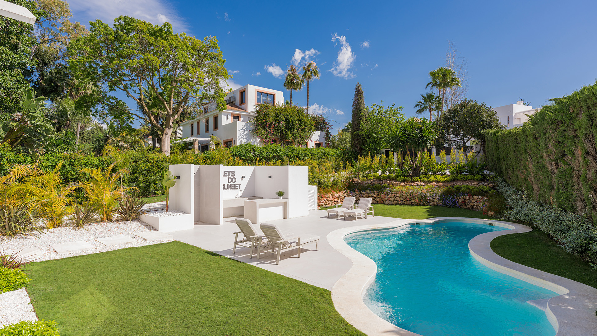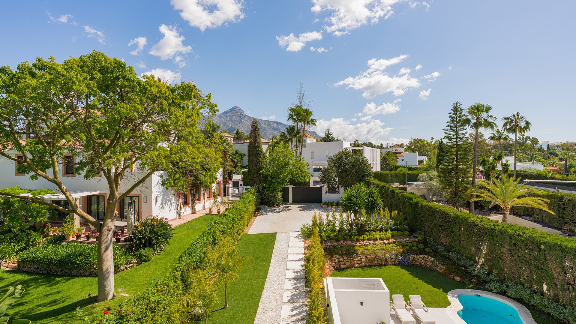 Villa Bianca ist eine nach Osten ausgerichtete Immobilie im Herzen des Golf Valley in Nueva Andalucia. Perfekt für eine Familie mit Kindern, ist es etwa 2 km von Aloha College und ideal für Golfer, die in der Nähe von Aloha Golf Club und in Gehweite von Las Brisas und Los Naranjos Golfclubs. Diese ruhige Wohnanlage mit hochwertigen Einfamilienhäusern grenzt an eine Grünfläche und einen Teich.