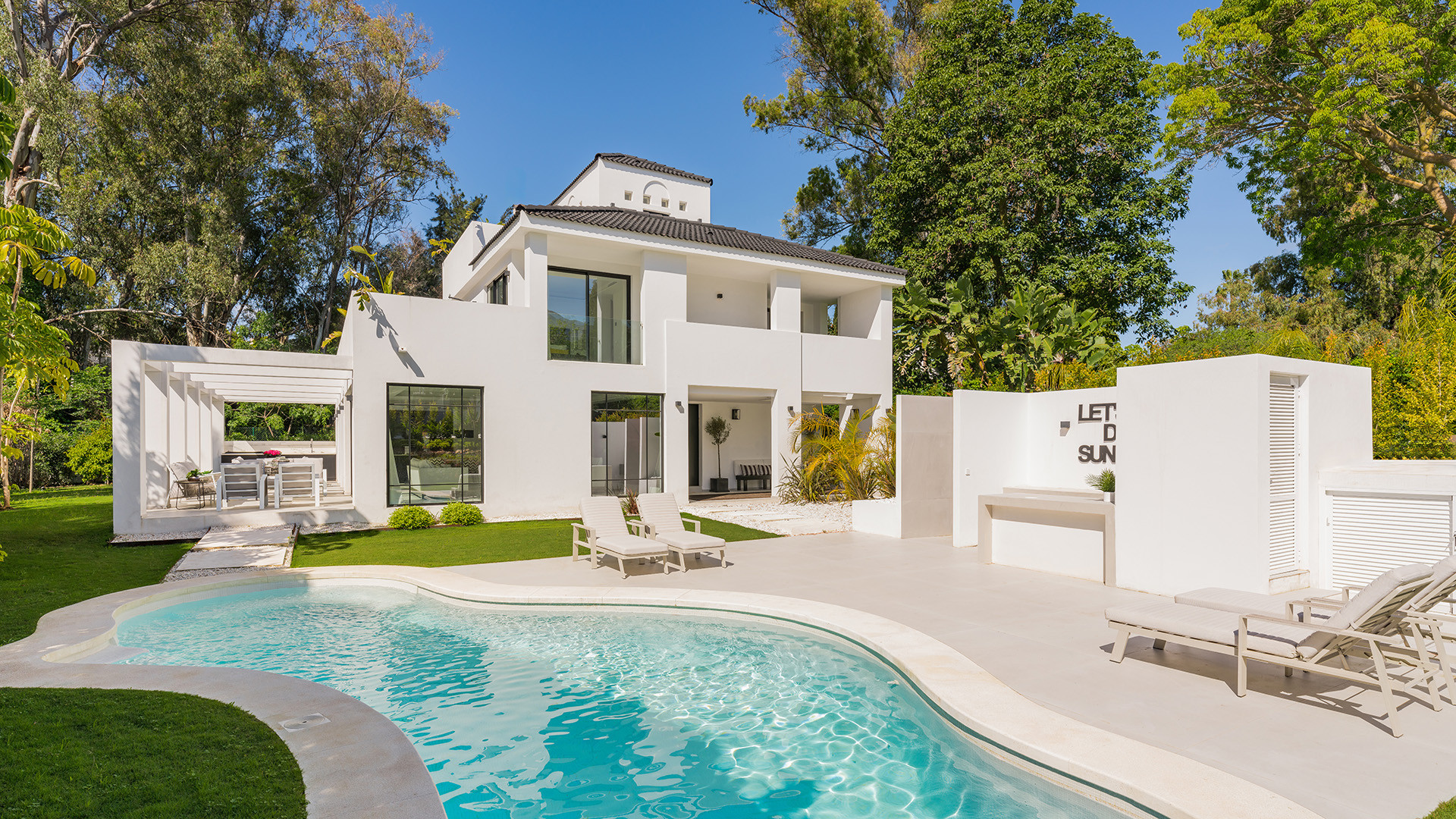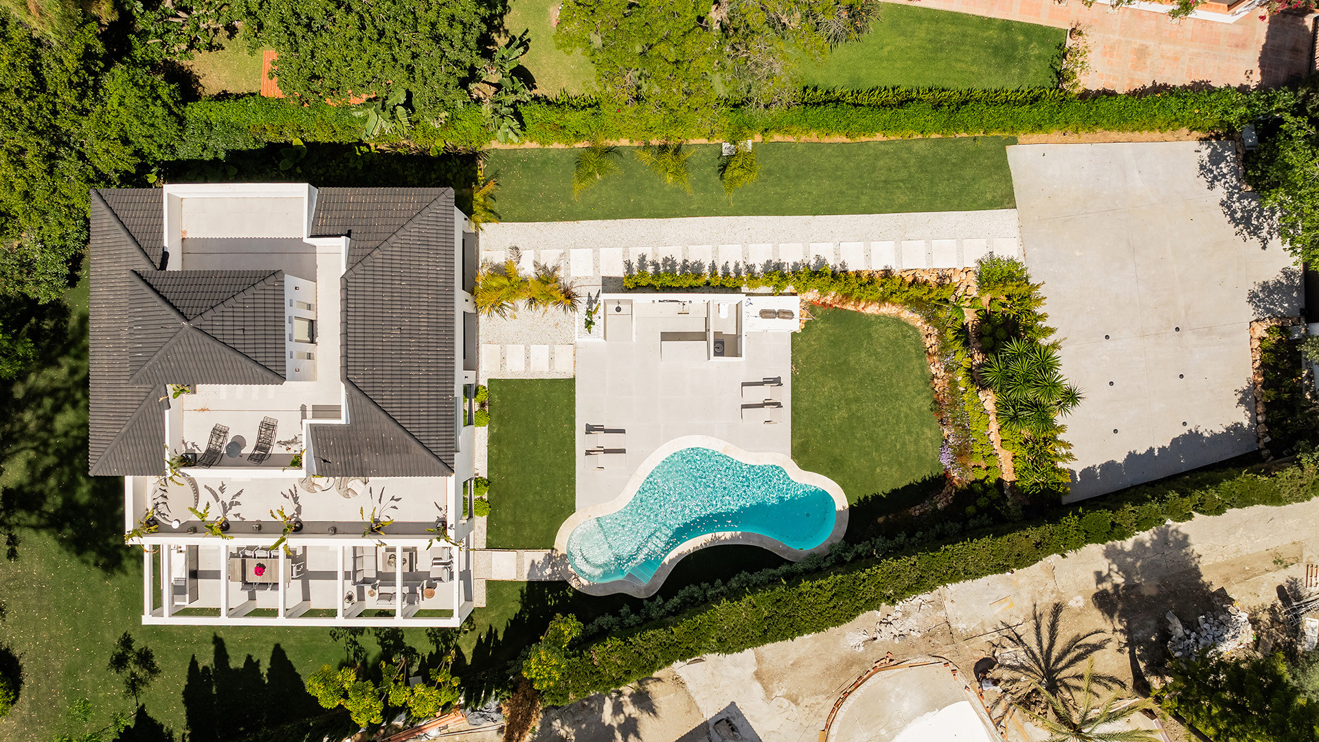 Der Außenbereich der Villa ist ebenso beeindruckend, mit einem makellosen Swimmingpool und einer Poolbar, die perfekt für die Unterhaltung von Gästen oder zum Entspannen an warmen Sommertagen ist. Die Dachterrasse bietet zusätzlichen Platz, um den Panoramablick und das schöne Wetter zu genießen.