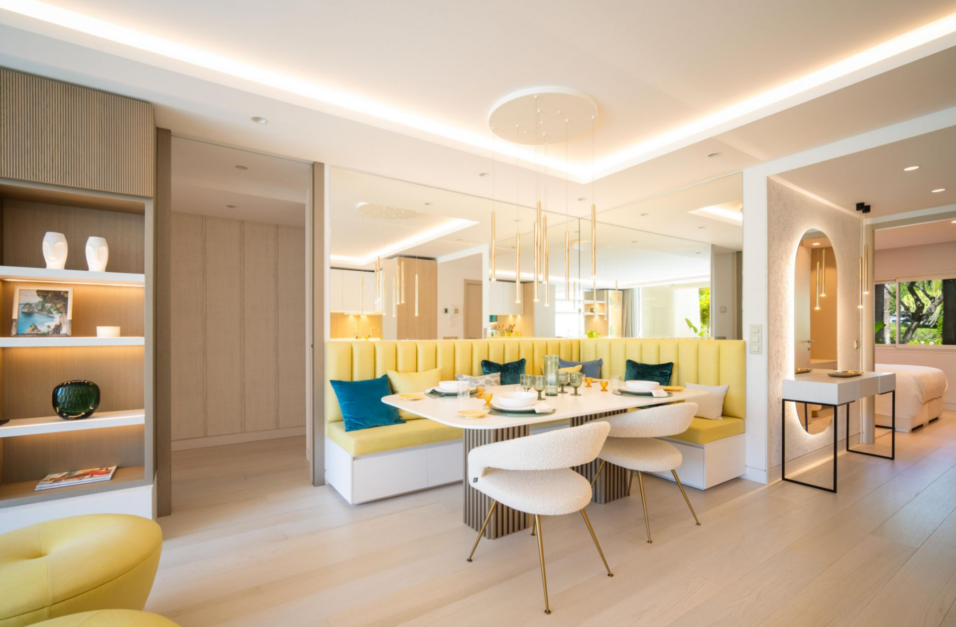 Im Inneren setzen geschmackvolle Farbakzente die sorgfältig ausgewählten Möbel in Szene und schaffen einen intimen und einladenden Raum. Die gemütliche Essecke neben der eleganten, modernen Küche mit viel Stauraum und hochmodernen Geräten trägt zur charmanten Atmosphäre der Wohnung bei, die durch einen Barbereich für Gäste ergänzt wird.