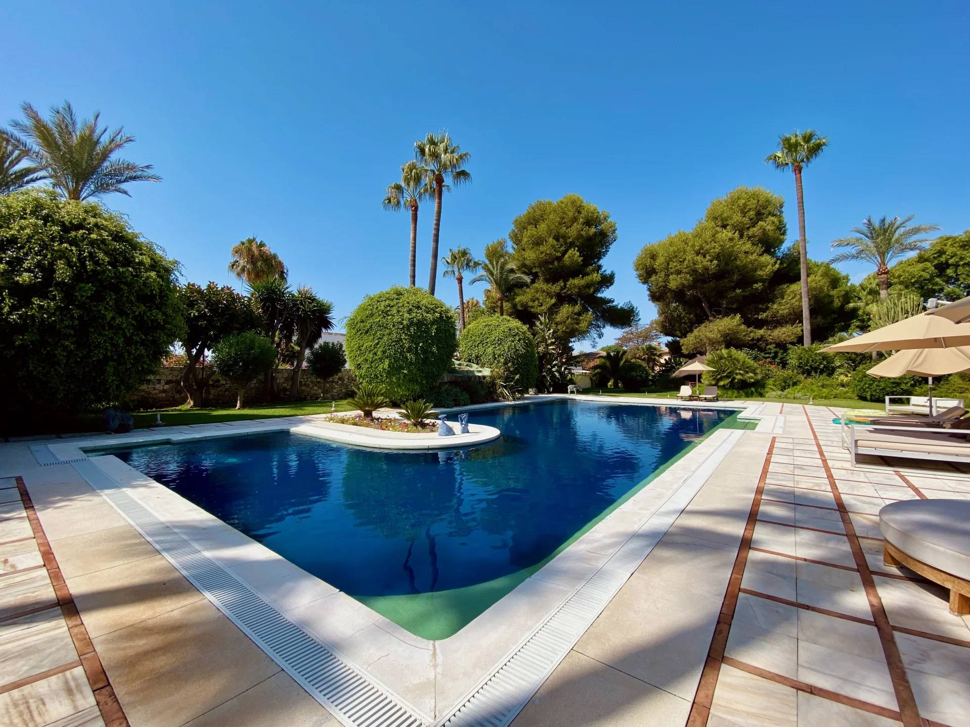 Die üppigen Gärten bieten eine beeindruckende Auswahl an Pflanzen und Obstbäumen. Der 25 × 10 m große Swimmingpool mit eigener Wasserleiter ist integraler Bestandteil des gepflegten, wunderschön angelegten, lichtgefüllten Gartens mit zwei Brunnen und reifer Vegetation.