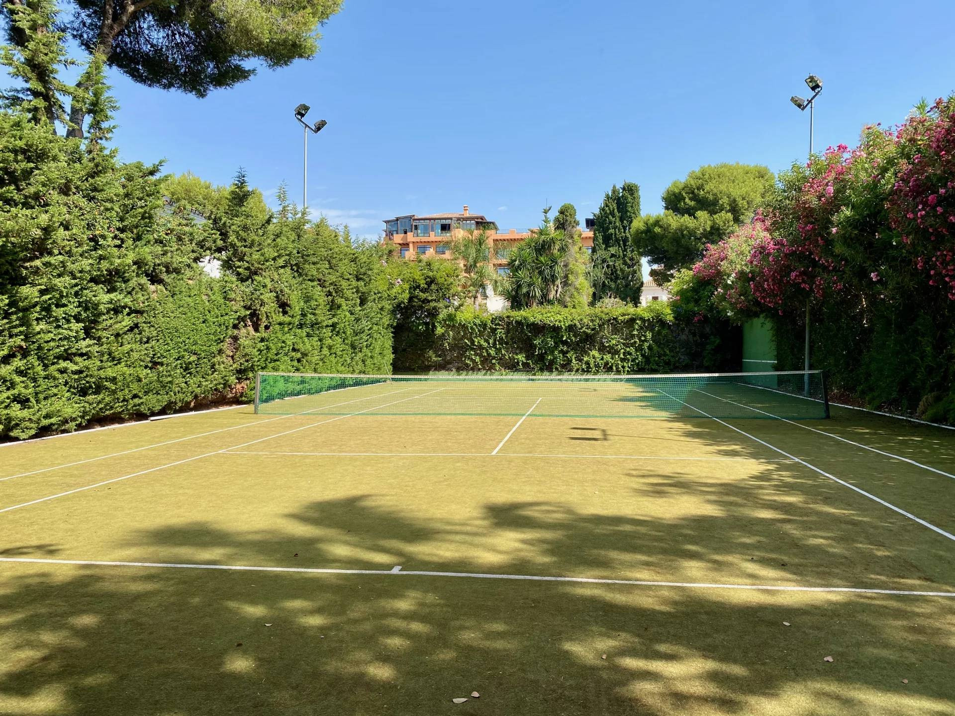 Es gibt auch einen ganzjährig künstlichen Gras Tennisplatz mit automatischem Bewässerungssystem und reichlich Beleuchtung.