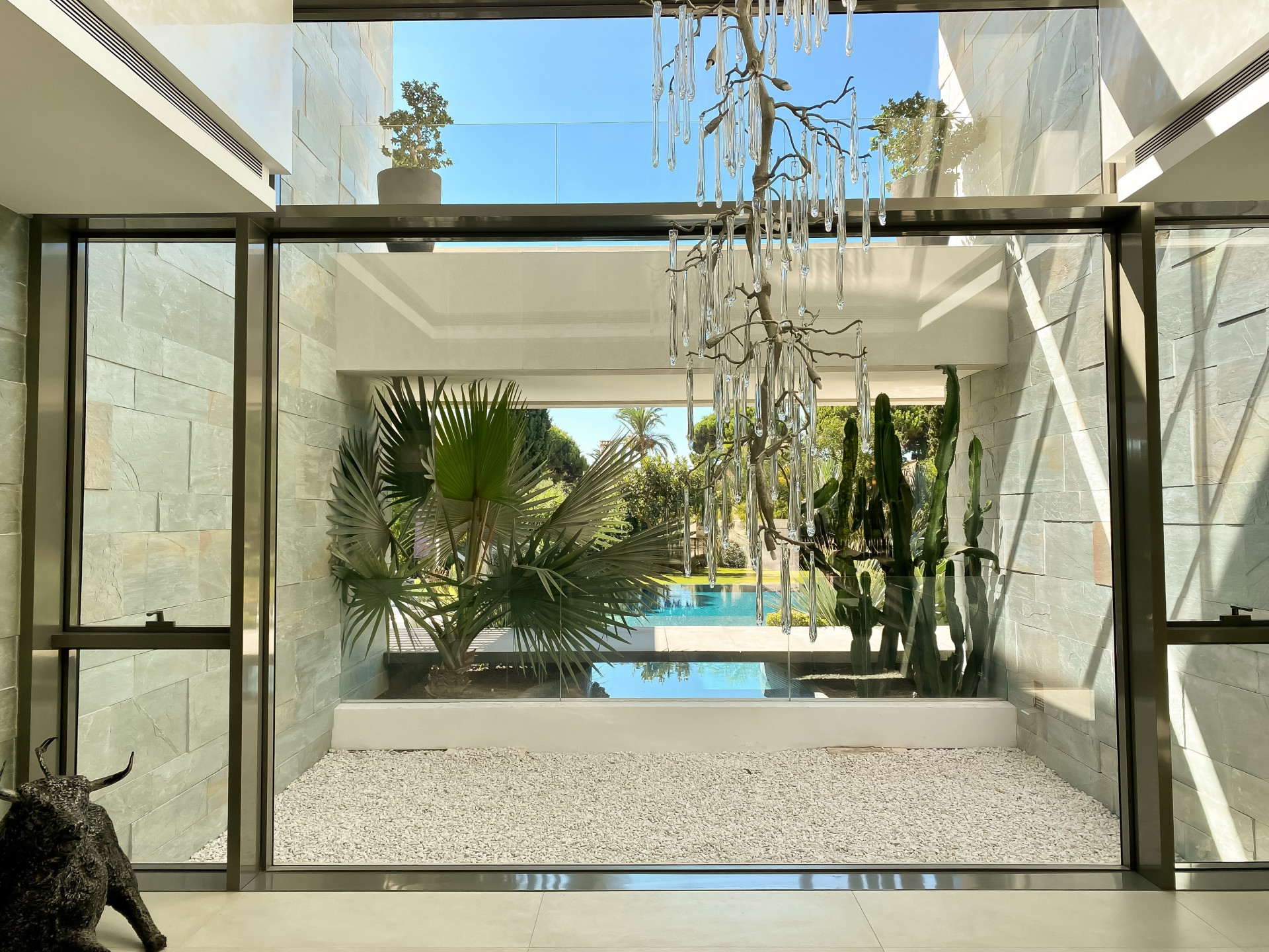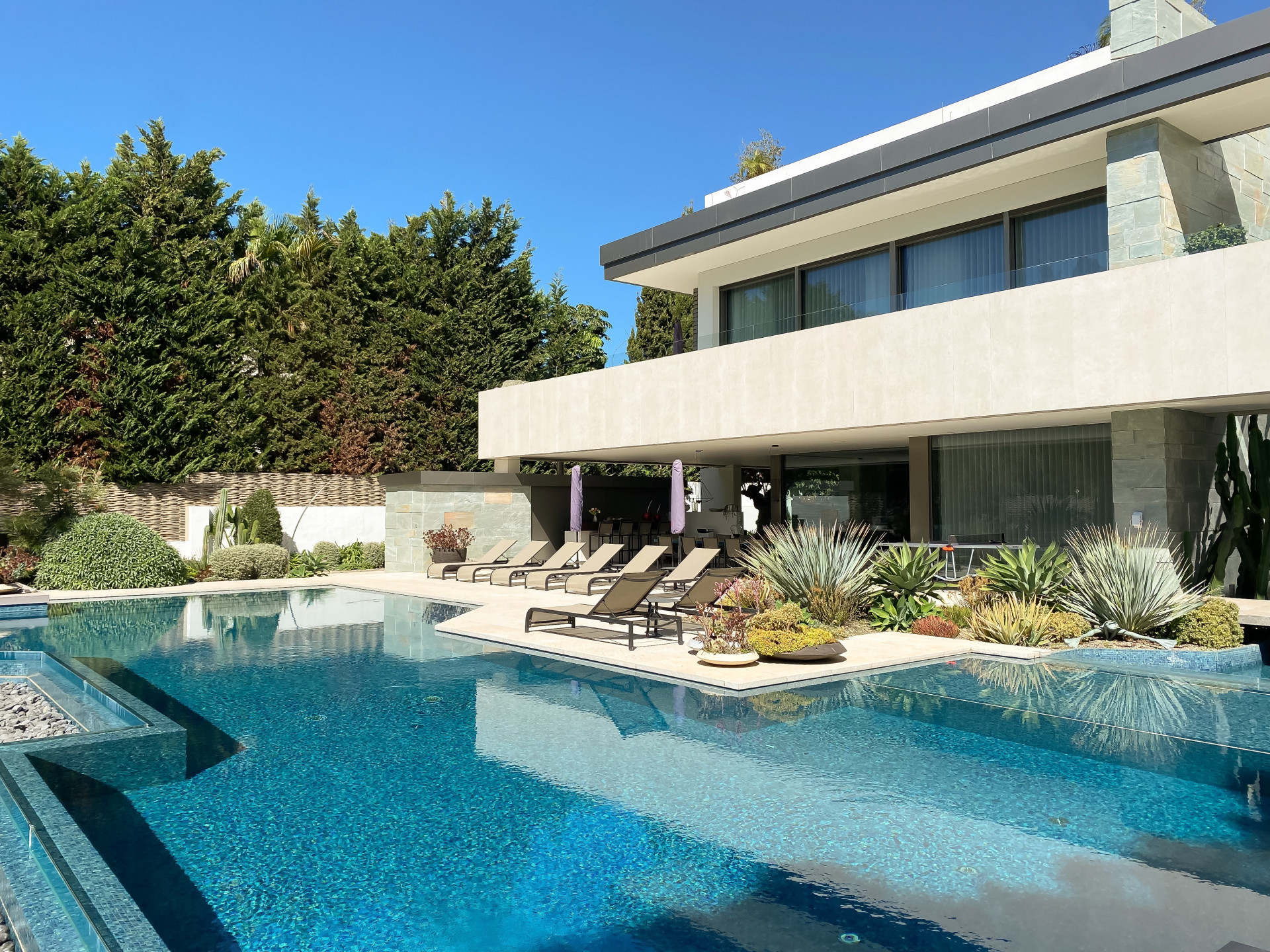 Sehr exklusive neue moderne Luxusvilla mit 6 Schlafzimmern im Marbella Club Hotel an der Goldenen Meile. Luxuriöse Wohnfläche einschließlich Innen- und Außenbereich, 6 Schlafzimmer, Kinoraum, Cocktail-Bar und Lounge, Fitnessraum, Spa mit Massage & Beauty-Raum, verfügt über Glasaufzug, Dachgarten und zwei Swimmingpools, in einer privaten Enklave von angelegten Gärten komplett mit Personalunterkünften und umfangreiche Garagen gesetzt.