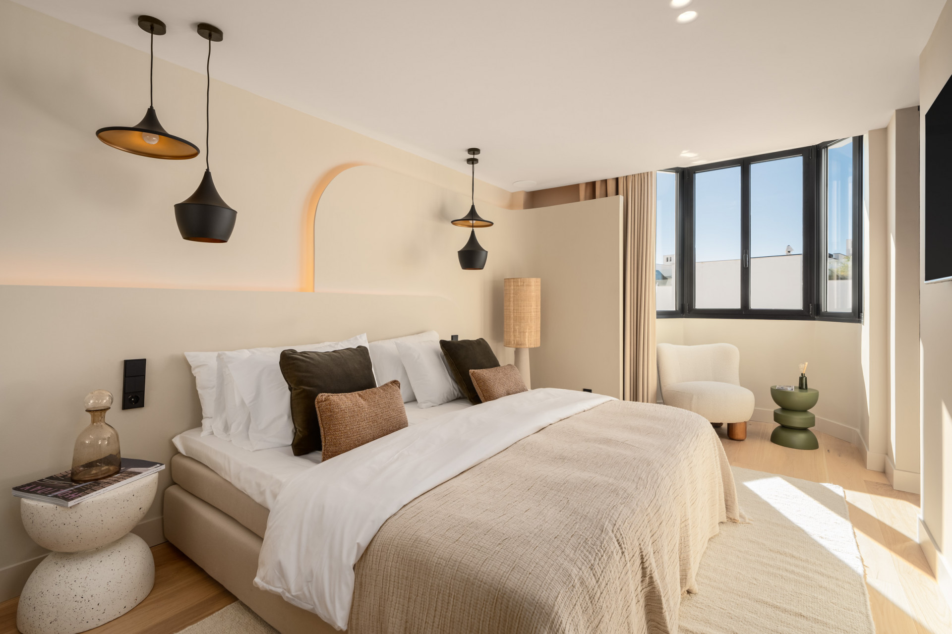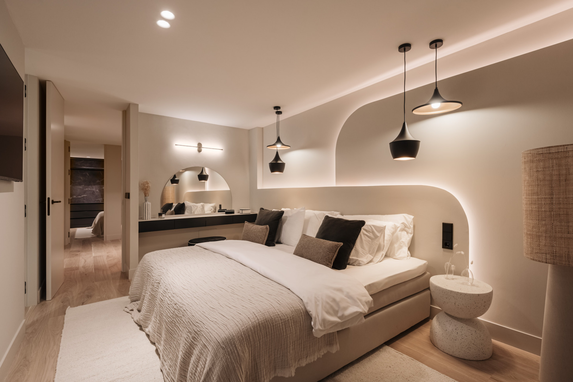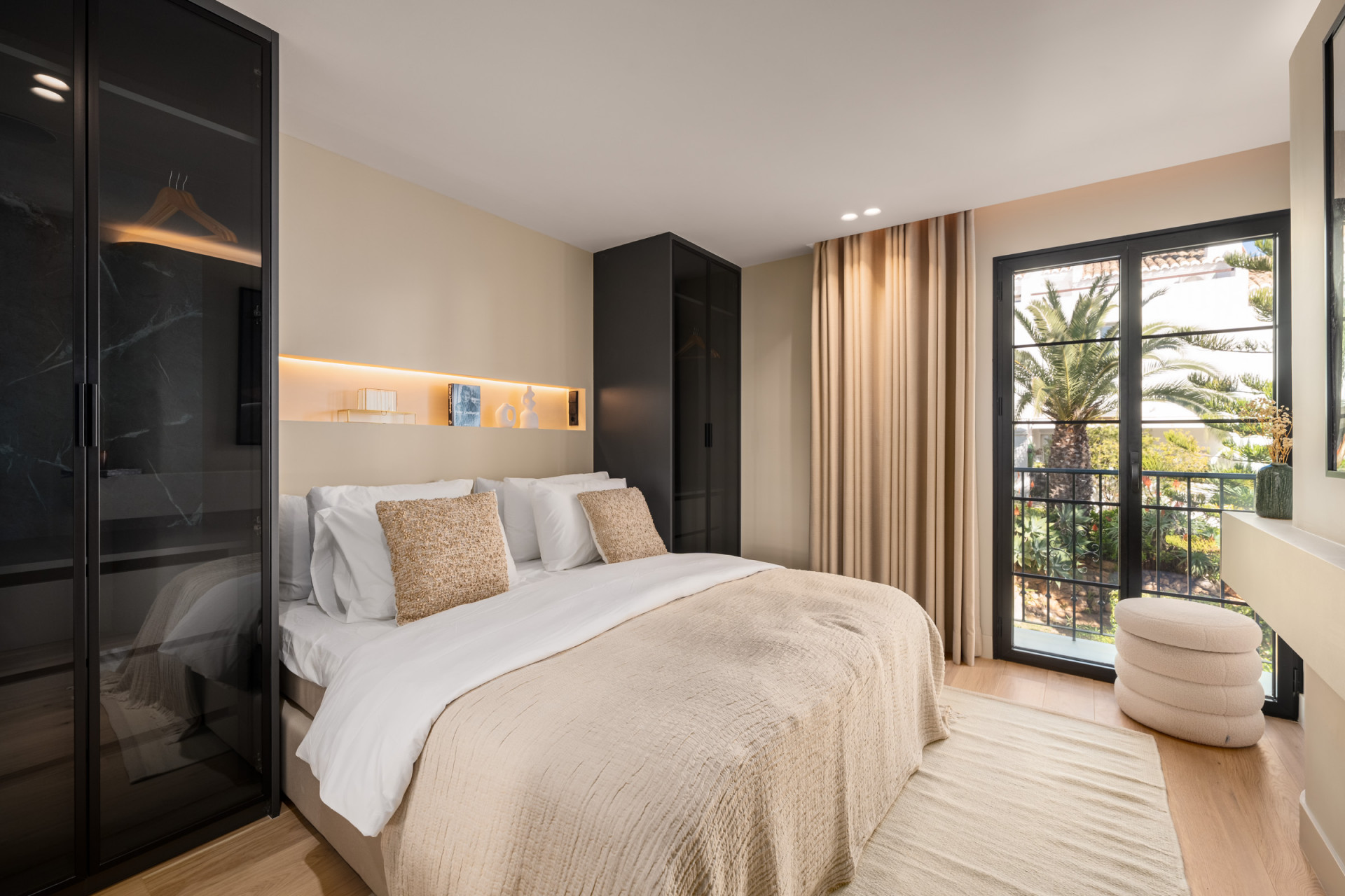 Die Master-Suite ist ein privates Refugium mit einem luxuriösen Bad, einem geräumigen begehbaren Kleiderschrank und einem privaten Balkon mit atemberaubendem Blick auf das Mittelmeer. Zwei weitere Gästeschlafzimmer teilen sich ein stilvolles Bad und Zugang zu einer gemeinsamen Terrasse. Ein viertes Schlafzimmer mit eigenem Bad sorgt für Flexibilität für Familie oder Gäste.