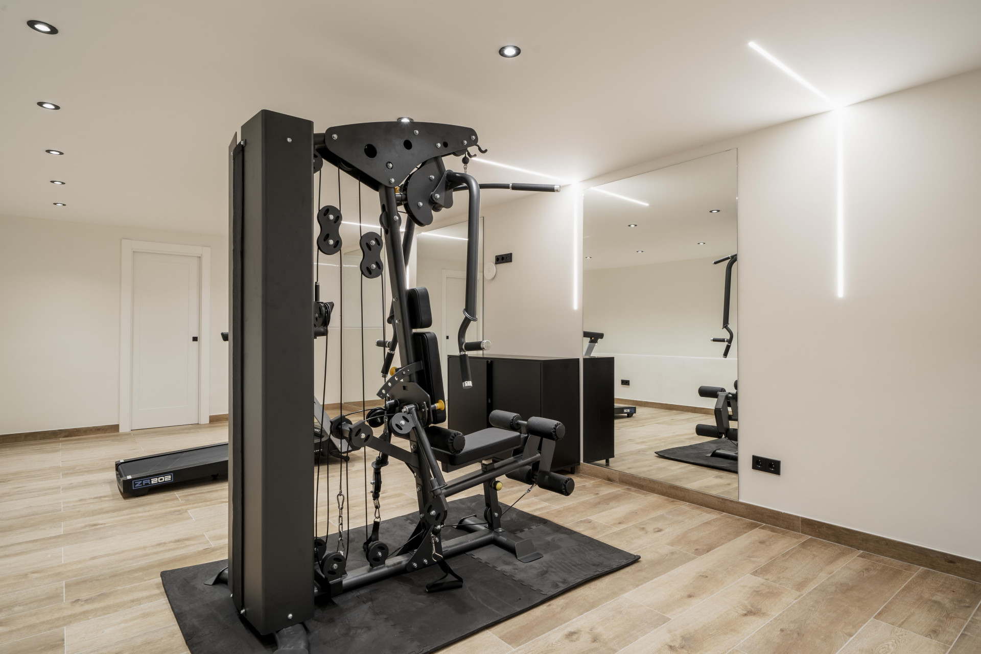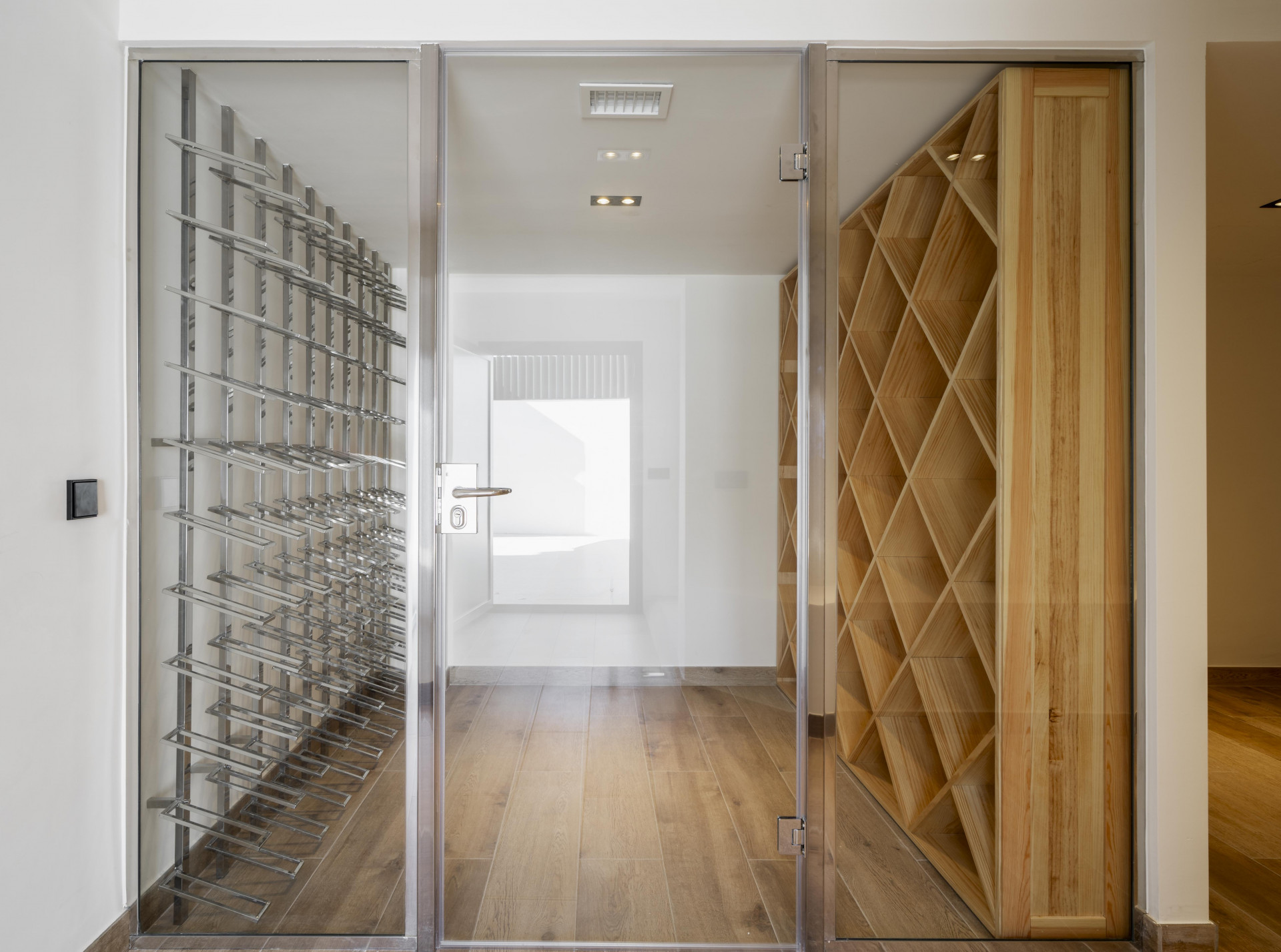 Ein separater, privat zugänglicher Bereich beherbergt einen maßgeschneiderten Weinkeller, einen voll ausgestatteten Fitnessraum und ein zusätzliches Badezimmer, was die Funktionalität und den Komfort dieser außergewöhnlichen Residenz noch weiter erhöht.