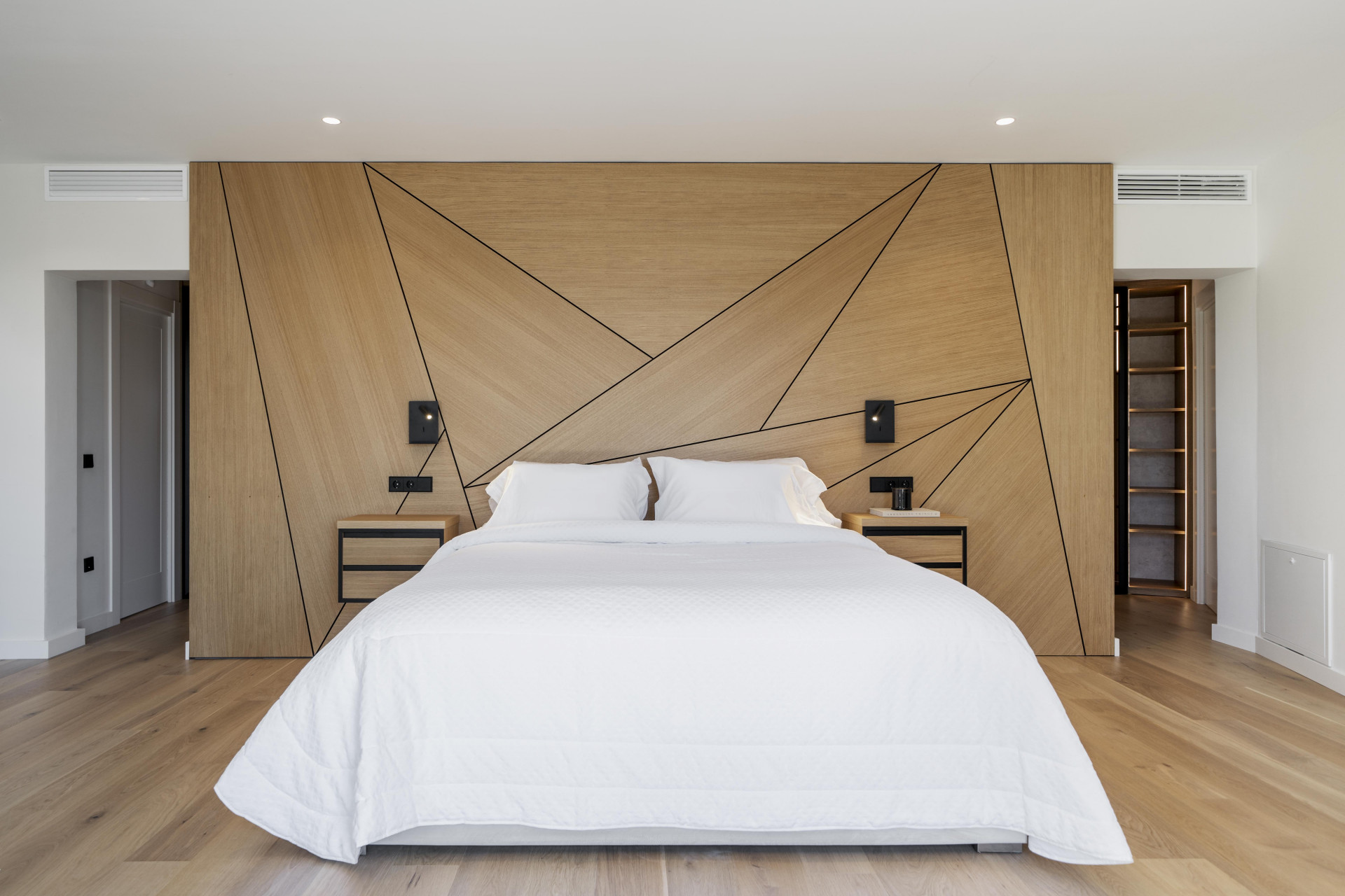 Über eine Treppe oder einen modernen Aufzug gelangt man in die obere Etage, die ganz der Master-Suite gewidmet ist. Dieser luxuriöse Rückzugsort verfügt über zwei Vollbäder, die durch ein großes, glasgetäfeltes Ankleidezimmer verbunden sind. Der Schlafbereich und die private Terrasse mit Glasgeländer bieten einen ungehinderten Blick auf das Meer und eignen sich perfekt, um die mediterranen Sonnenuntergänge zu genießen.