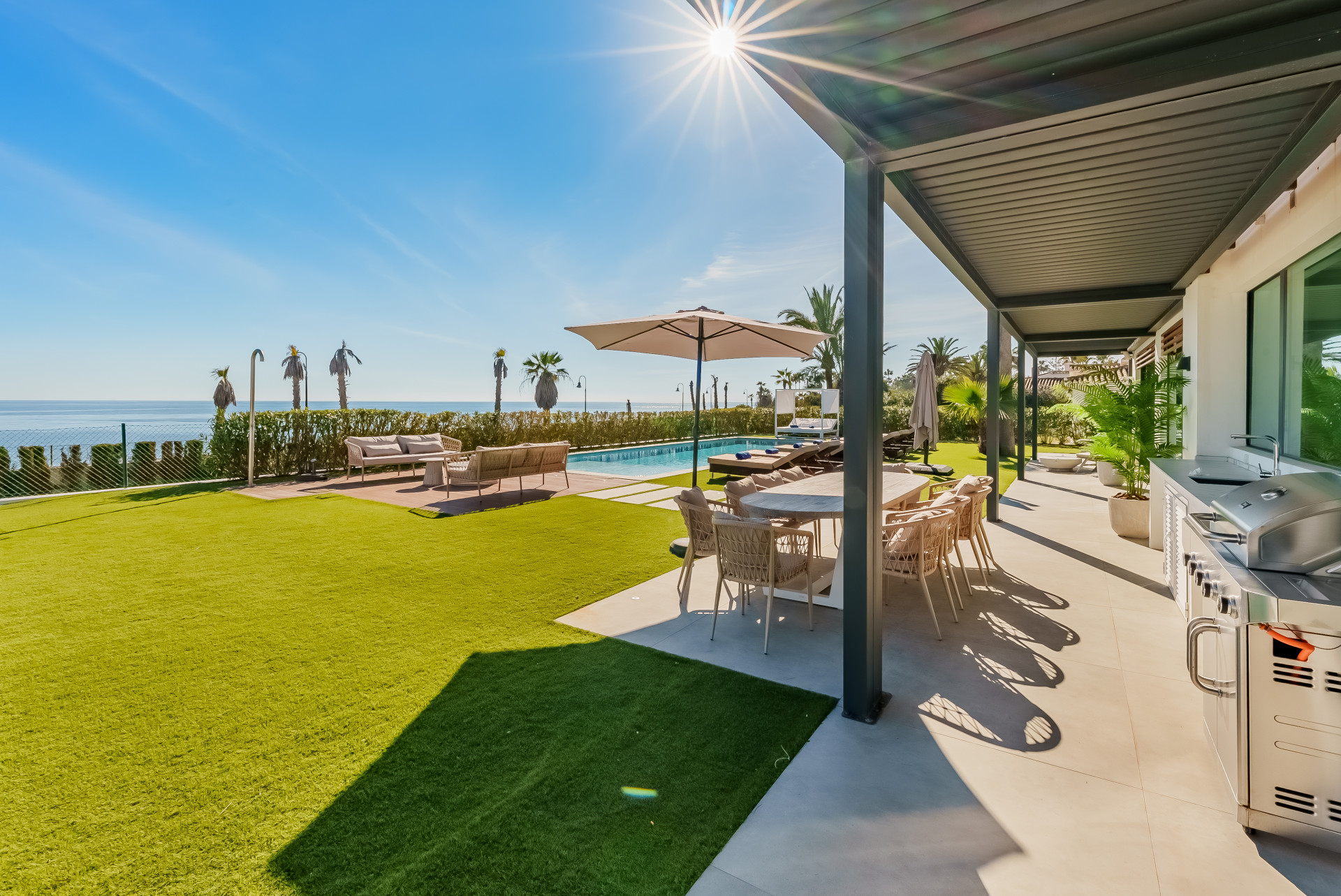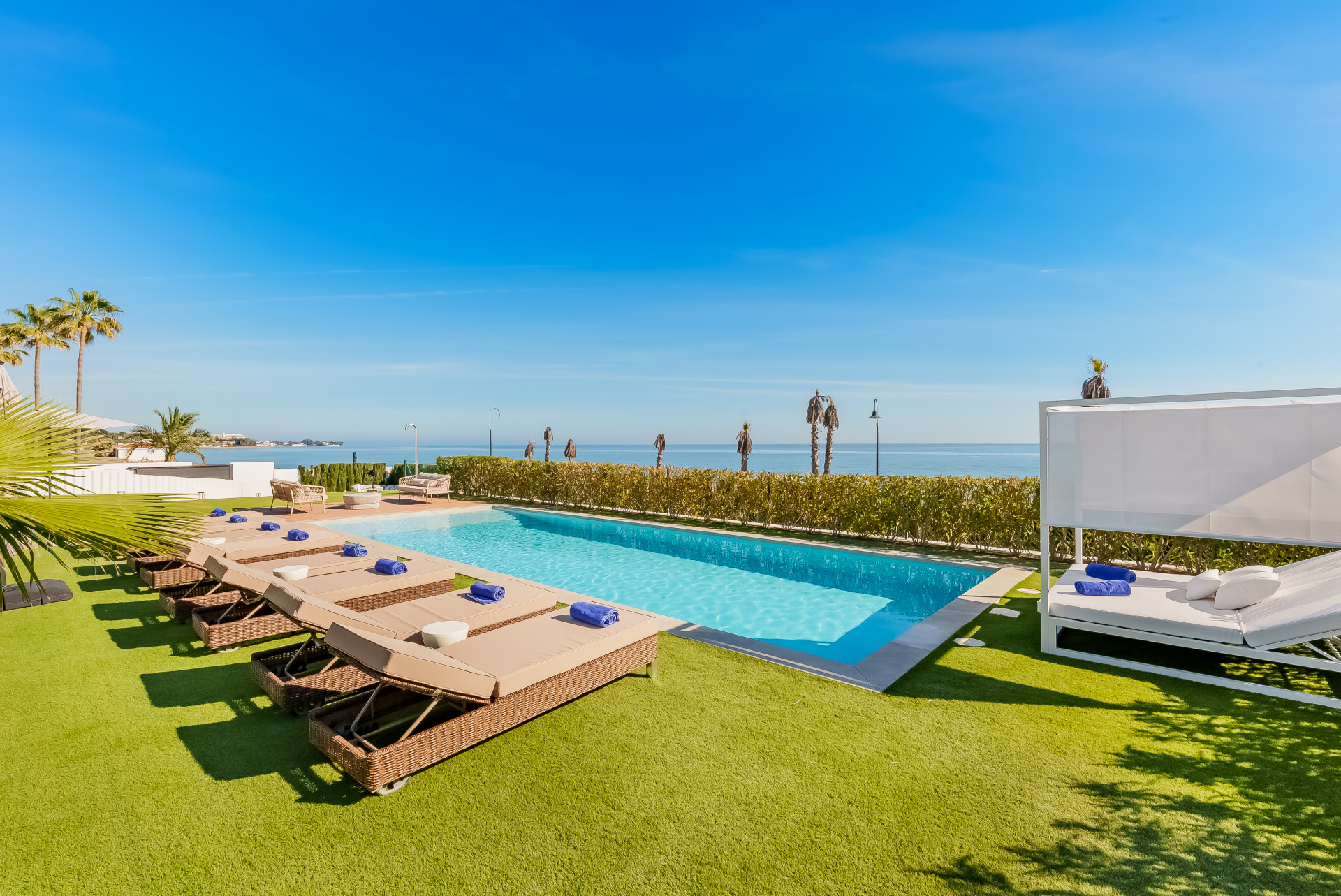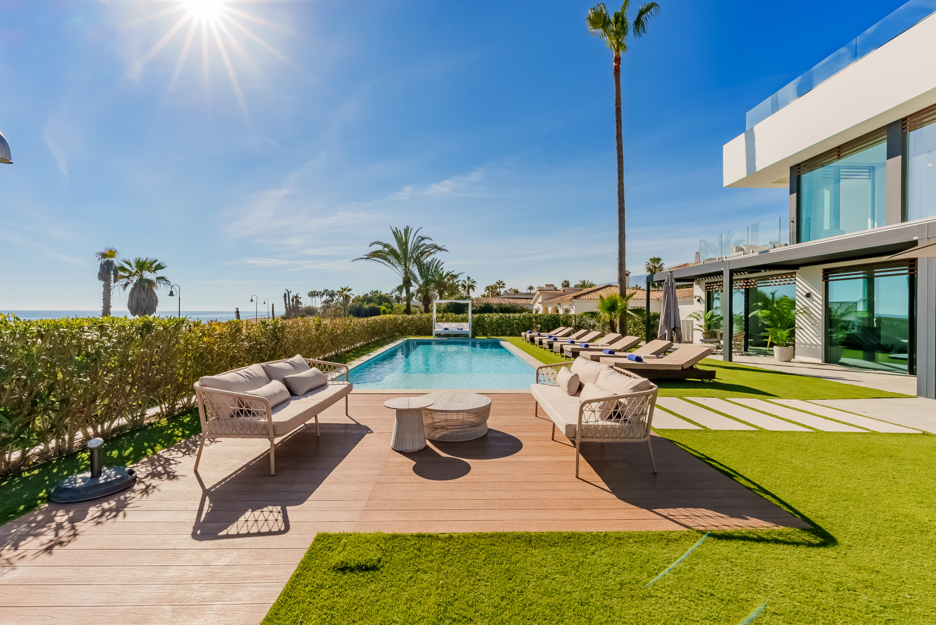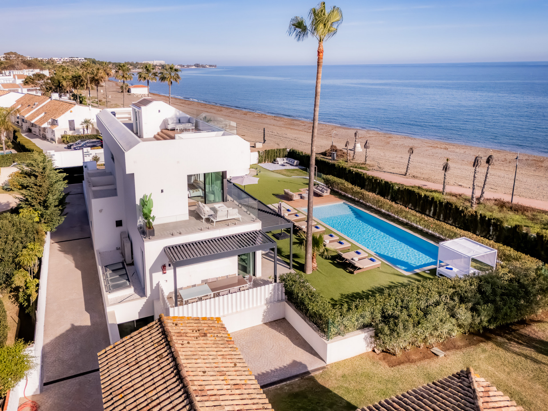 A contemporary showpiece villa sitting in a privileged beachfront position in the New Golden Mile, boasting of panoramic sea views, surrounded by an expansive private garden with a large private swimming pool. The ideal family estate offering a dynamic outdoor lifestyle, perfect for water sports enthusiasts, with direct access to the beach from the front garden. The villa presents a modern open plan layout, large floor to ceiling terraces allowing plenty of light to shine through, contemporary interiors paired with high quality finishes. Boasting of 5 spacious bedrooms all with en suite bathrooms, each one presenting beautiful scenic sea views. A fantastic feature of this property is the expansive roof terrace, offering the ultimate entertainment space with multiple lounge areas, a jacuzzi and the breathtaking panoramic views of the Mediterranean Sea. On the basement level, this estate offers a luxurious spa with indoor heated swimming pool and sauna. Located on the New Golden Mile in Playa del Saladillo with lovely wide beaches and beautiful sand dunes.