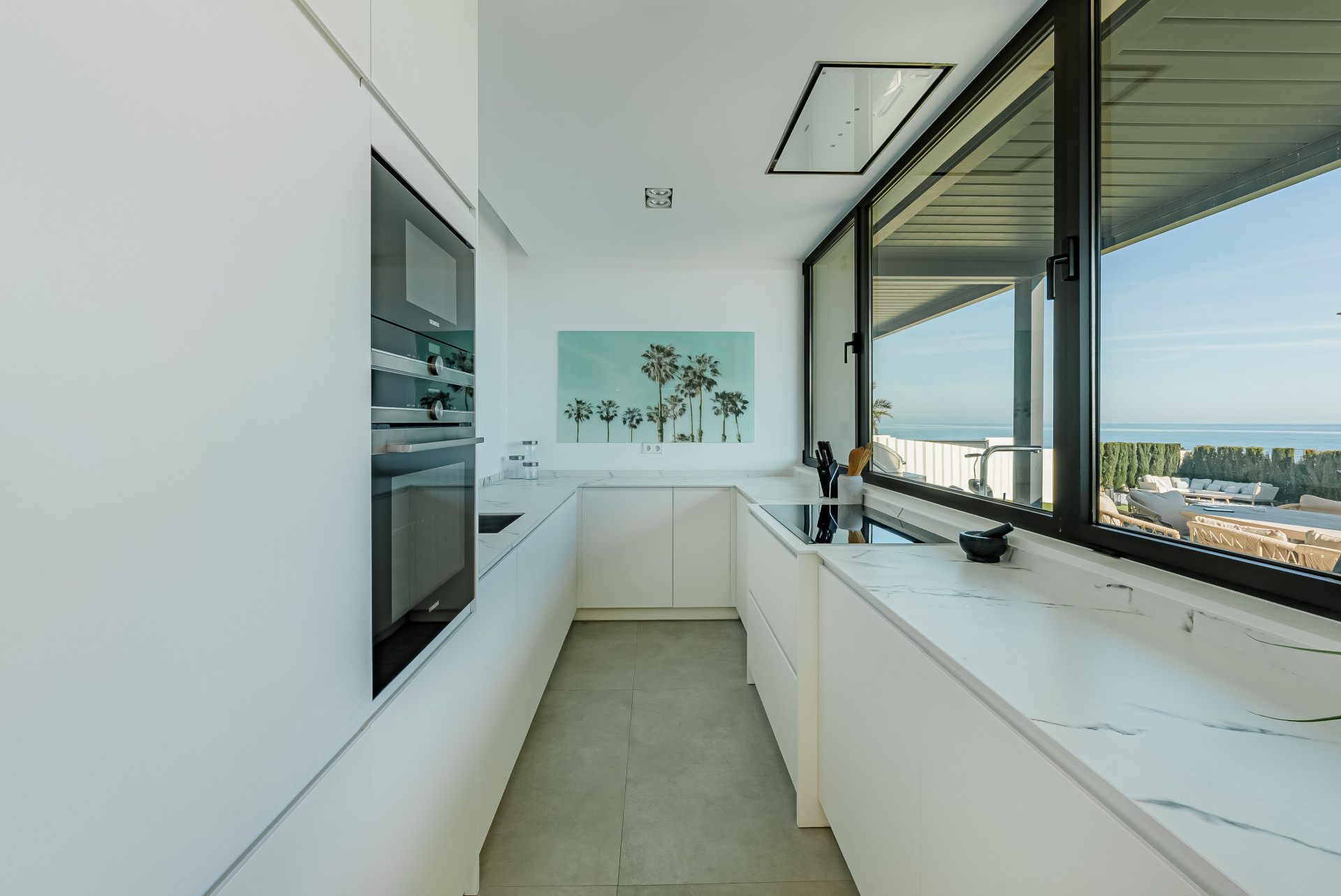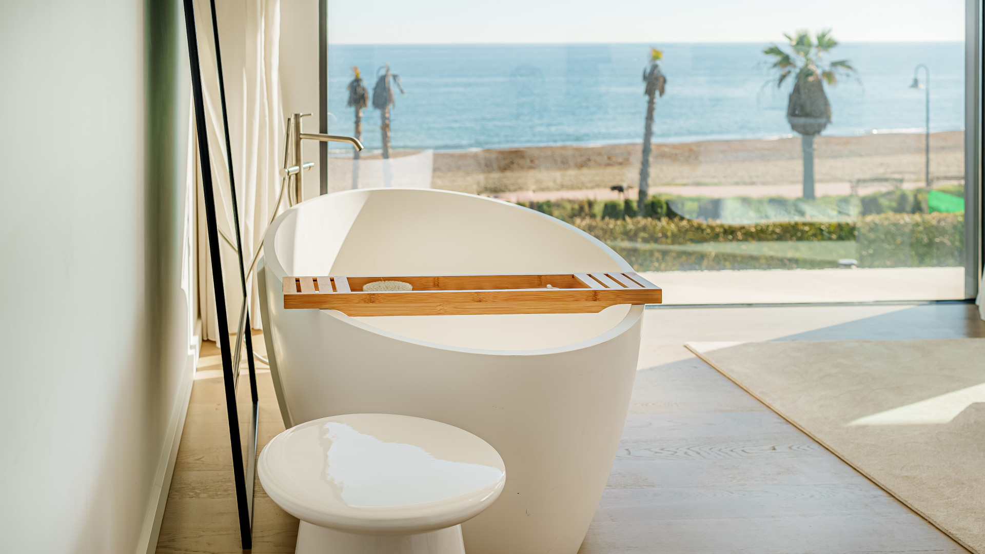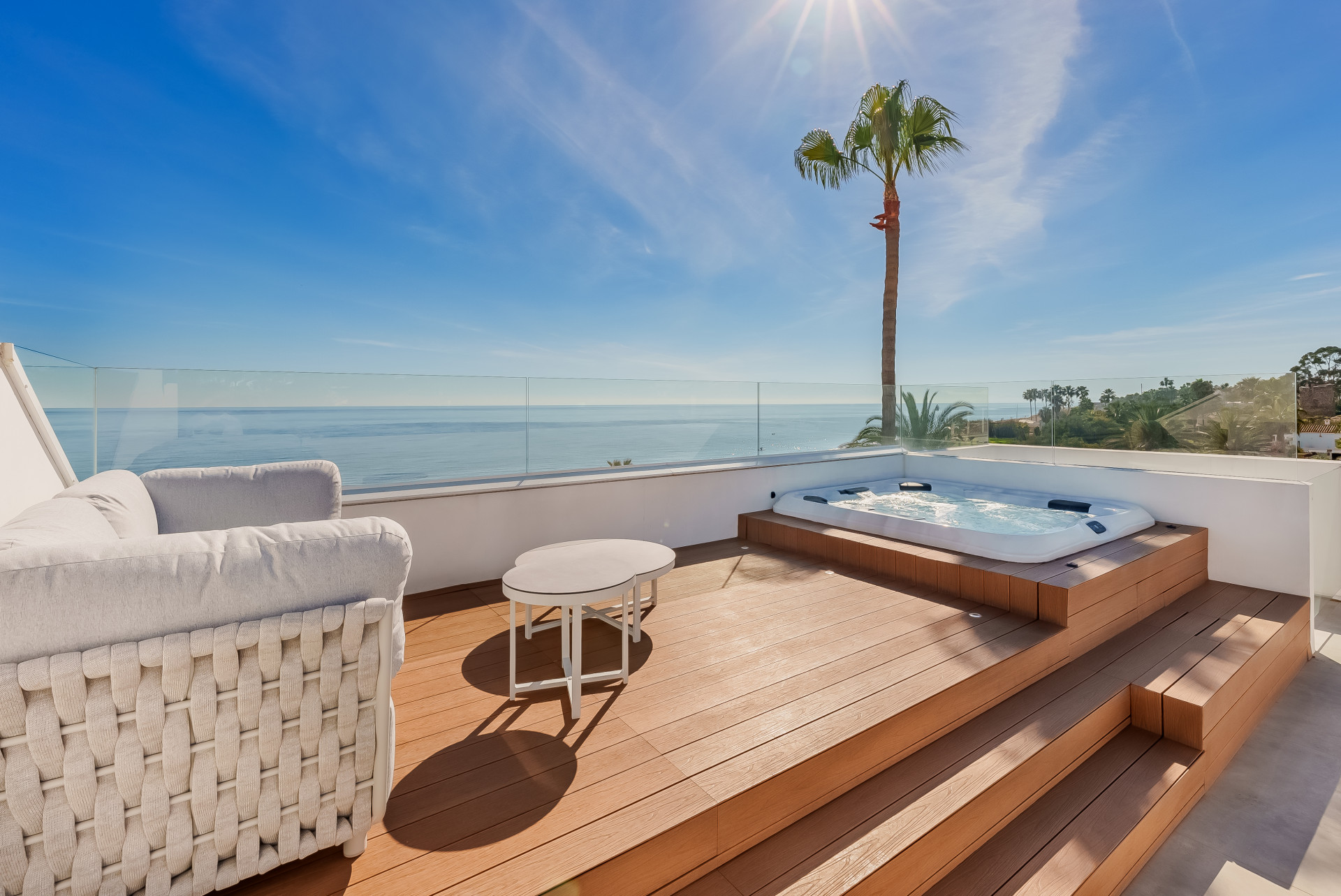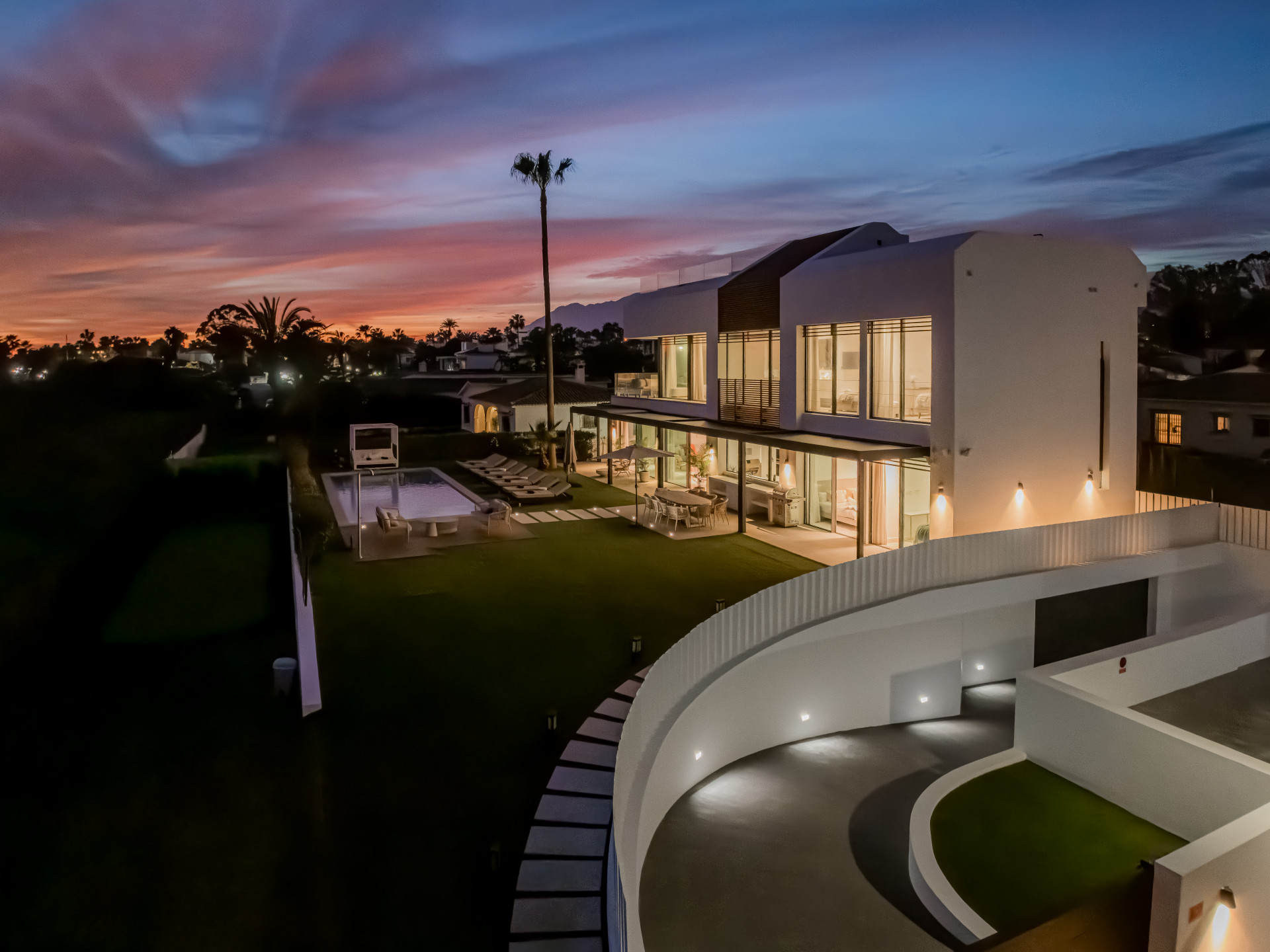 A contemporary showpiece villa sitting in a privileged beachfront position in the New Golden Mile, boasting of panoramic sea views, surrounded by an expansive private garden with a large private swimming pool. The ideal family estate offering a dynamic outdoor lifestyle, perfect for water sports enthusiasts, with direct access to the beach from the front garden. The villa presents a modern open plan layout, large floor to ceiling terraces allowing plenty of light to shine through, contemporary interiors paired with high quality finishes. Boasting of 5 spacious bedrooms all with en suite bathrooms, each one presenting beautiful scenic sea views. A fantastic feature of this property is the expansive roof terrace, offering the ultimate entertainment space with multiple lounge areas, a jacuzzi and the breathtaking panoramic views of the Mediterranean Sea. On the basement level, this estate offers a luxurious spa with indoor heated swimming pool and sauna. Located on the New Golden Mile in Playa del Saladillo with lovely wide beaches and beautiful sand dunes.
