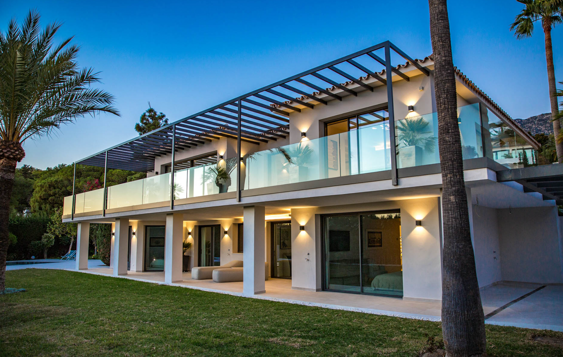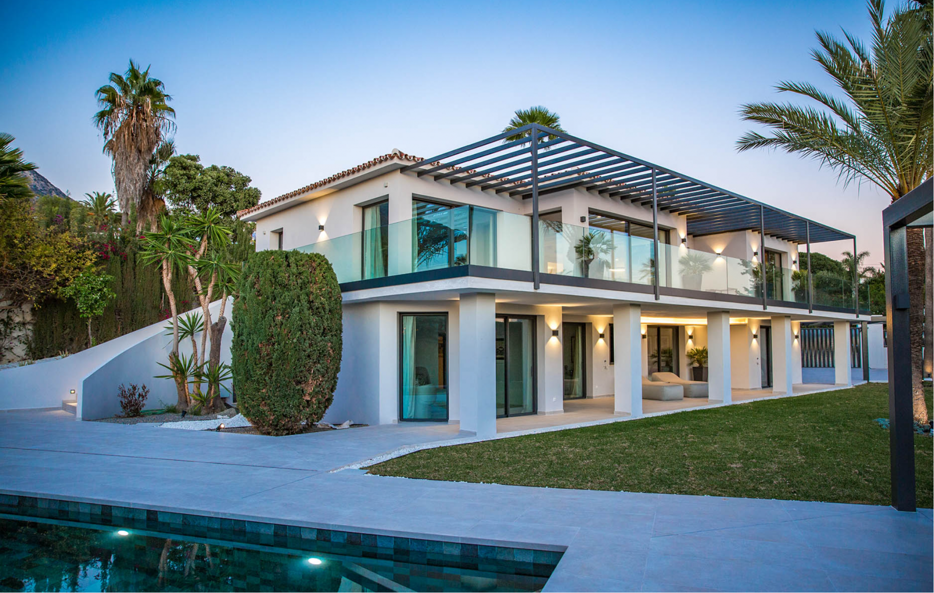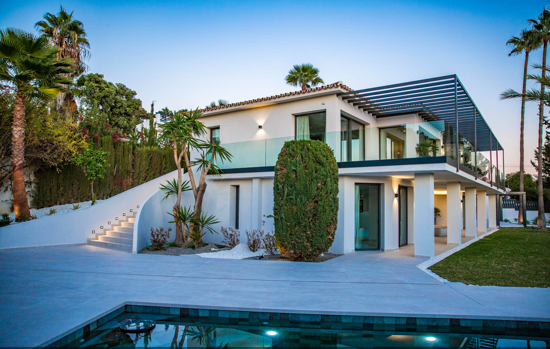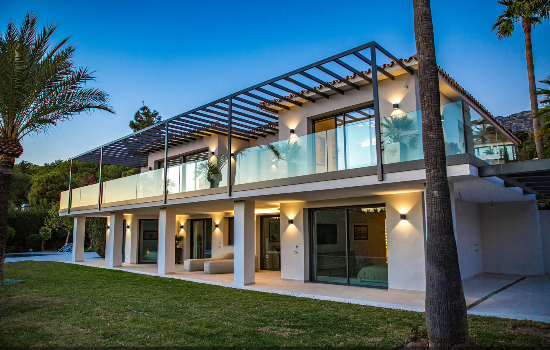 Pre-installation for solar and photovoltaic, underfloor heating and central air conditioning with zone air control, high quality ceramic/microcement floor tiles 120 x 120 interior/exterior 120 x 60, interior staircase with metal balustrade, wooden steps and step lighting, living terrace with glass balustrade and metal pergola covering the entire area, bathrooms with high quality sanitary facilities, High quality Kitchen and fully equipped laundry room and parking for 3 cars with Pergola.