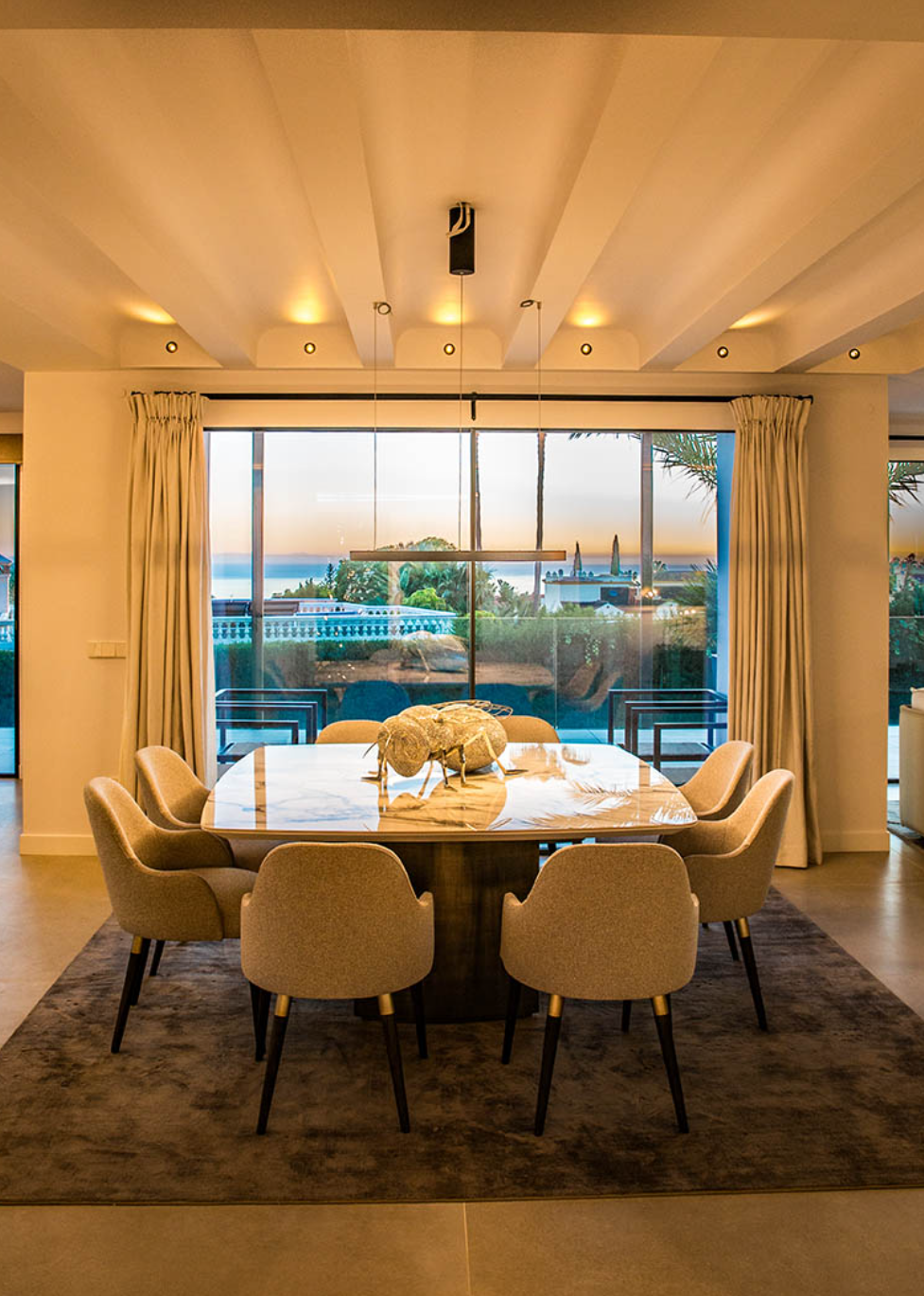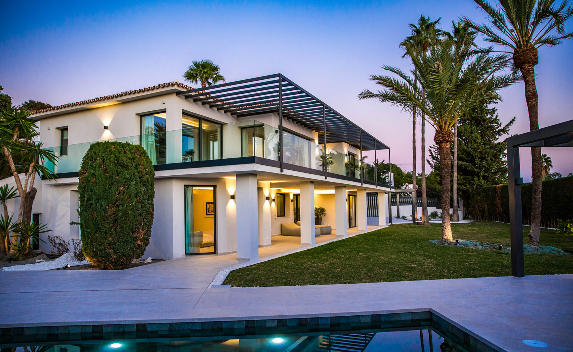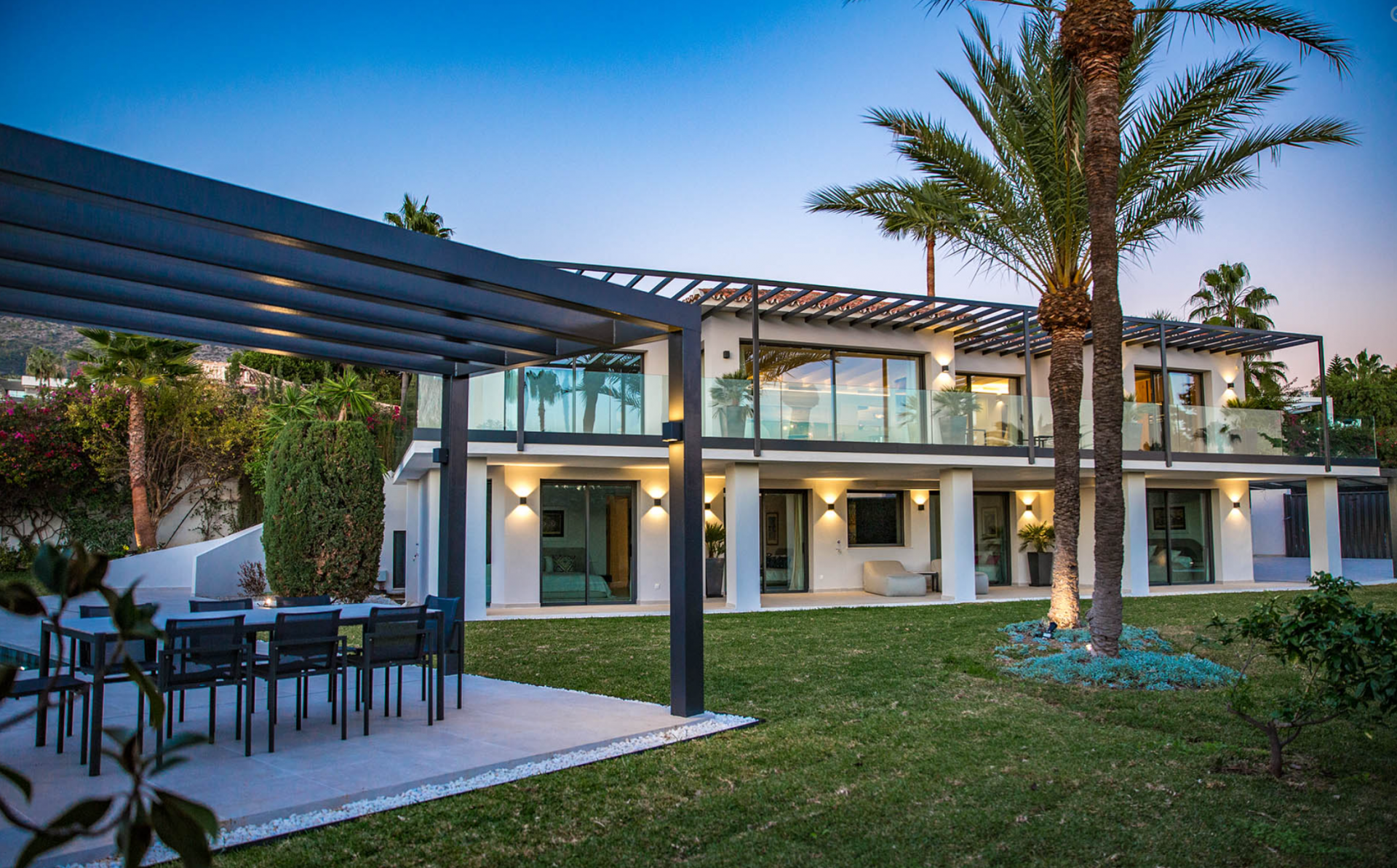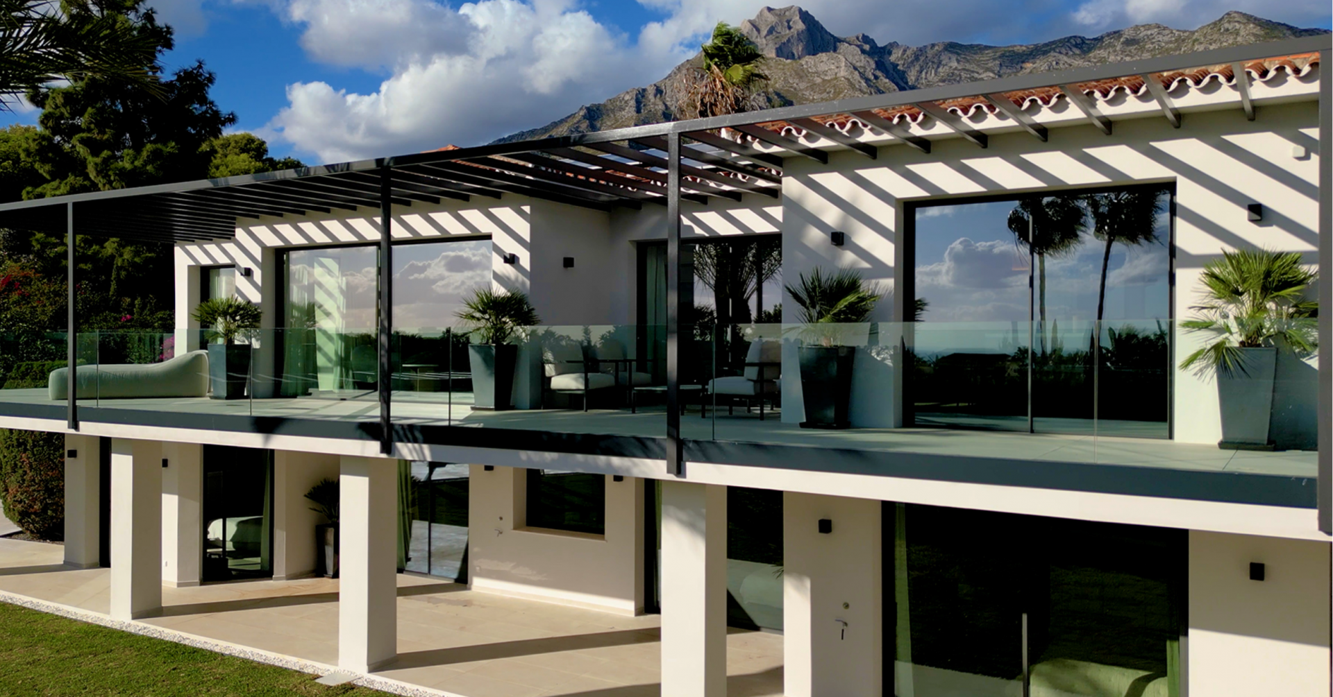 Pre-installation for solar and photovoltaic, underfloor heating and central air conditioning with zone air control, high quality ceramic/microcement floor tiles 120 x 120 interior/exterior 120 x 60, interior staircase with metal balustrade, wooden steps and step lighting, living terrace with glass balustrade and metal pergola covering the entire area, bathrooms with high quality sanitary facilities, High quality Kitchen and fully equipped laundry room and parking for 3 cars with Pergola.