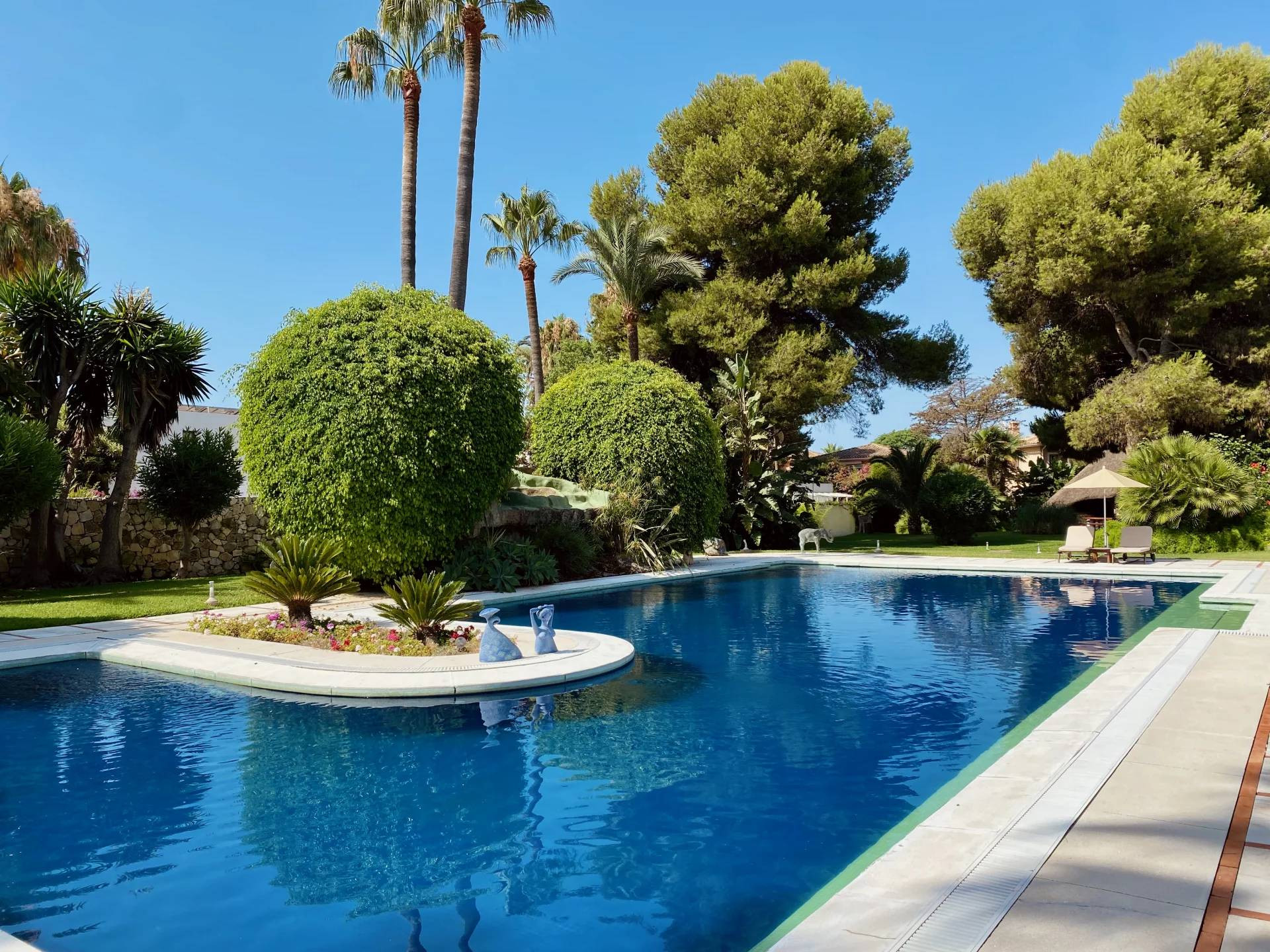 The lush gardens offer an impressive array of plants and fruit trees. The 25 × 10 m swimming pool with its own water ladder is an integral part of the well-kept, beautifully landscaped, light-filled garden with two fountains and mature vegetation.