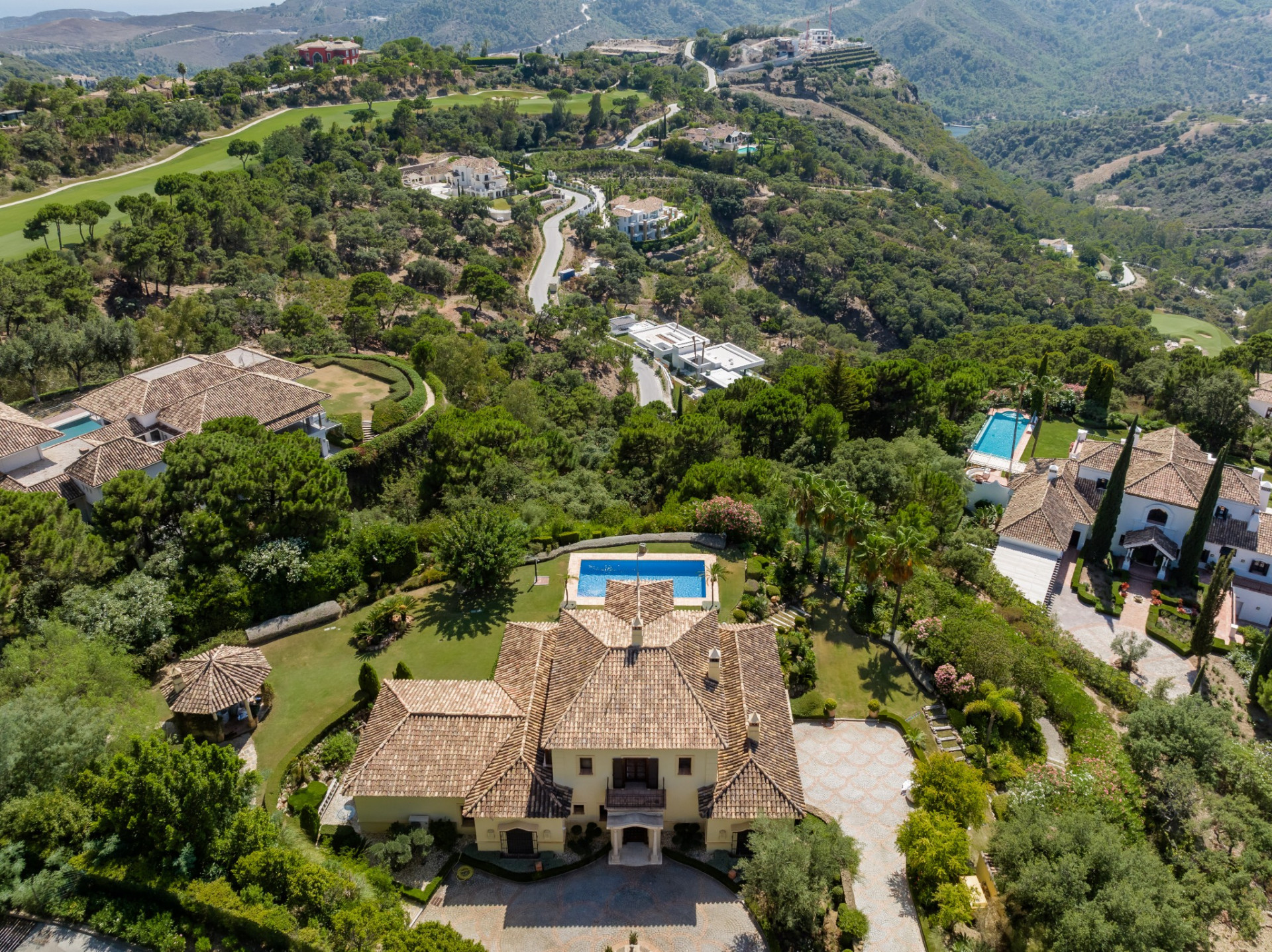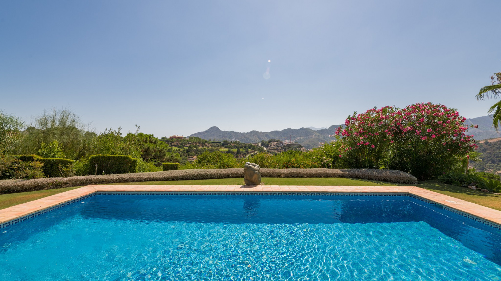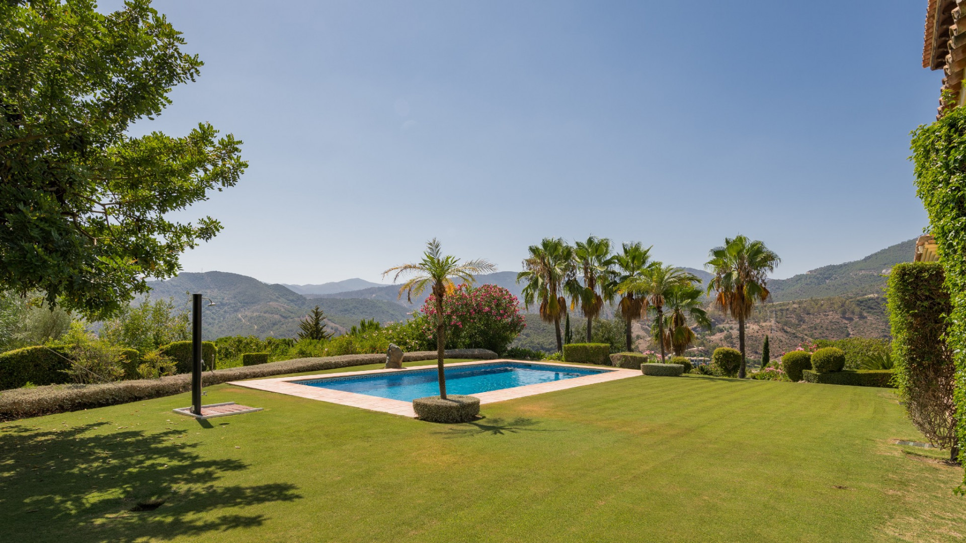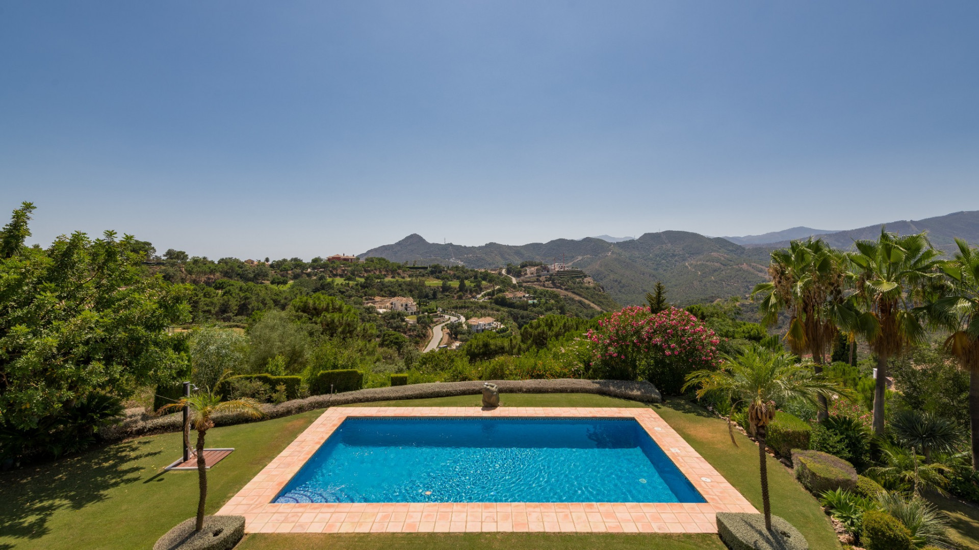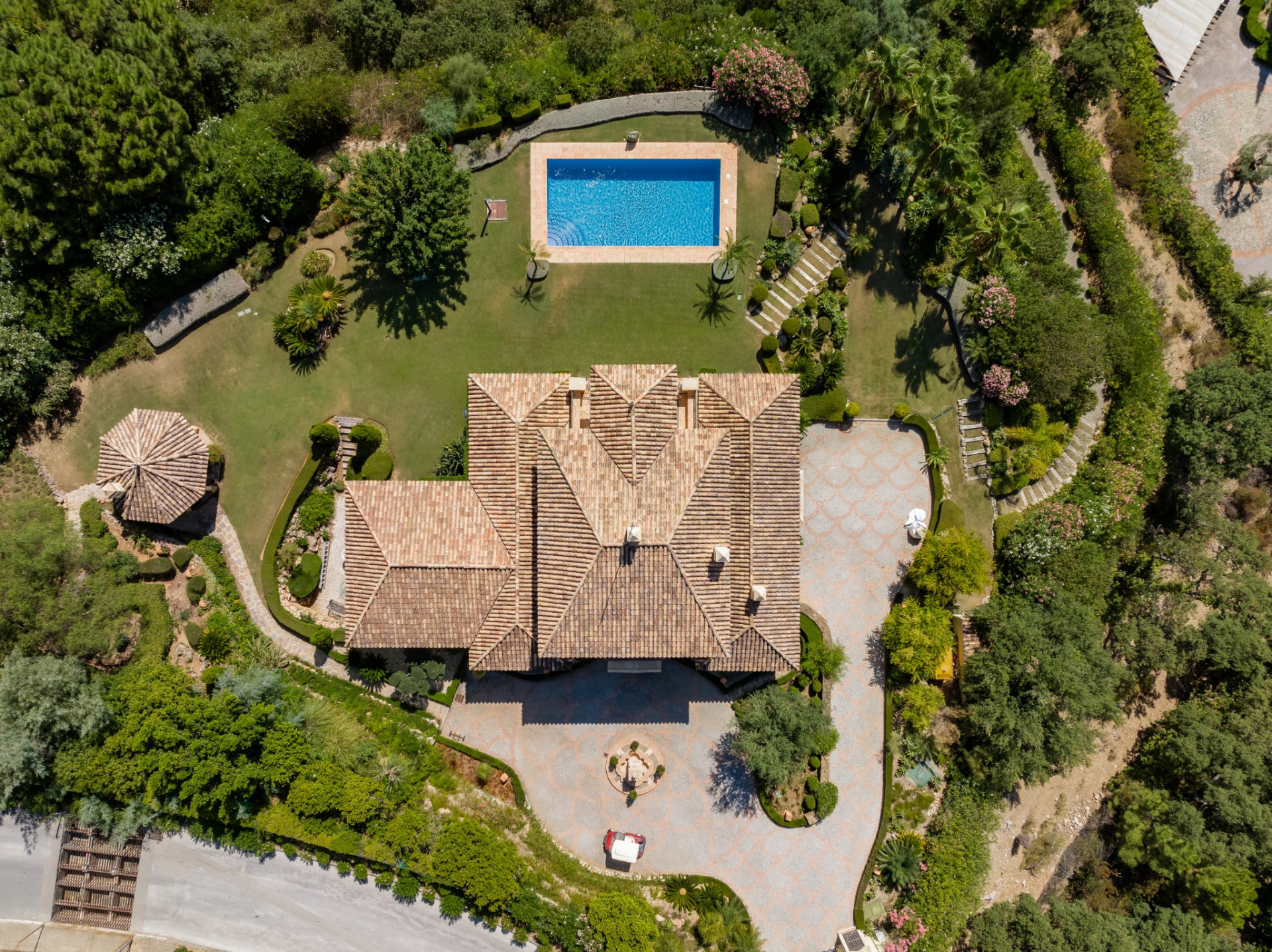 Traditional Andalusian style villa with open mountain views in La Zagaleta golf and country club, ones of Europe’s most exclusive residential complexes. It has 2 gated entrances with 24-hour security, two 18-hole golf courses with club houses, equestrian centre, heliport, racquets club and concierge services for its residents. A former hunting reserve, La Zagaleta spans over 900 hectares maintaining its natural surroundings with golf and sea views. The property is conveniently distributed over two floors plus basement and comprises an entrance hall, a living room with a fireplace leading out to the semi covered terrace with pool and garden views, an adjoining TV room, separate formal dining room with gabled ceilings decorated with wooden beams and a fully fitted kitchen with central island. Two en-suite bedrooms make up this floor, one of them with direct access to the covered terrace and garden. Upper floor is for the exclusive use of master bedroom with a nice dressing area and an spacious bathroom. At the basement there is the staff or guest apartment, this separate space is perfect for accommodating any live-in staff or guests, providing them with their own privacy and convenience. Also, wine cellar, utility room, big storage room, a large multifunctional room (to be converted into cinema room, gymnasium or spa) and spacious garage for 2-3 cars. As we step outside, you’ll be greeted by the enticing poolside area. The shimmering pool is an excellent place to relax and unwind on sunny days, and the gazebo offers the perfect spot for entertaining guests. Whether it’s a casual barbecue or a gathering with friends, the gazebo is equipped with a built-in barbecue, sink and cupboards, making hosting a breeze. The living spaces have been meticulously designed with terracotta floors, giving the home a warm and inviting ambiance. The wooden sliding double glazed windows not only provide excellent insulation but also allow you to enjoy the breathtaking views of the mountains, golf course, and countryside from every corner of the house.