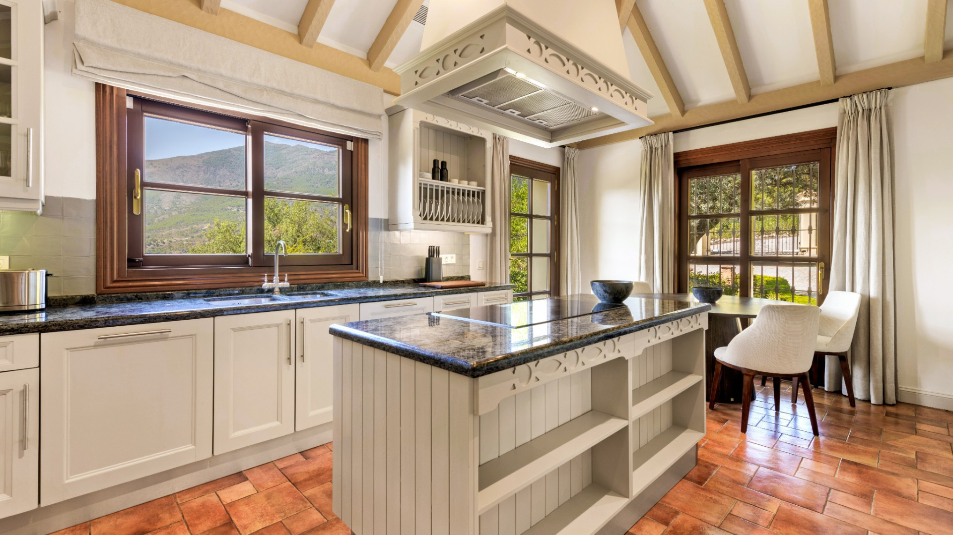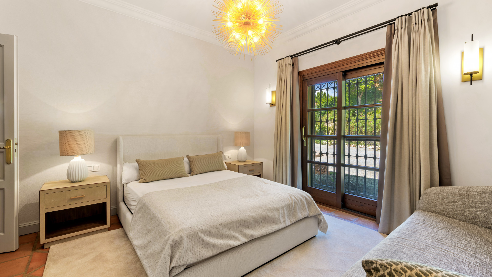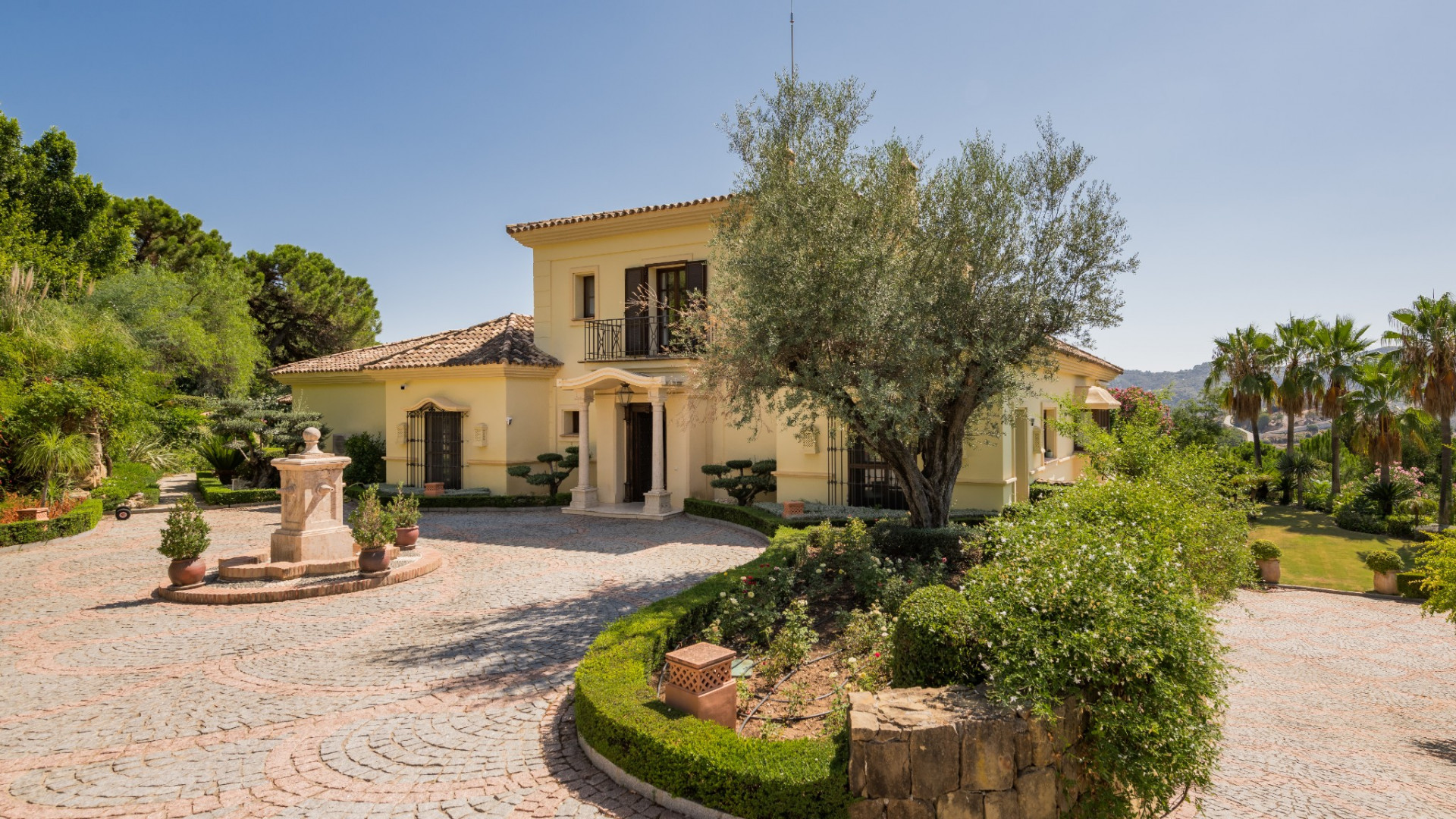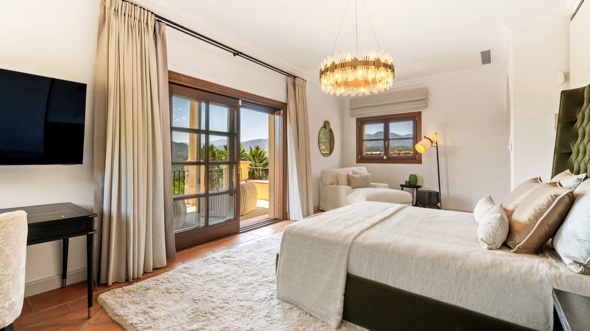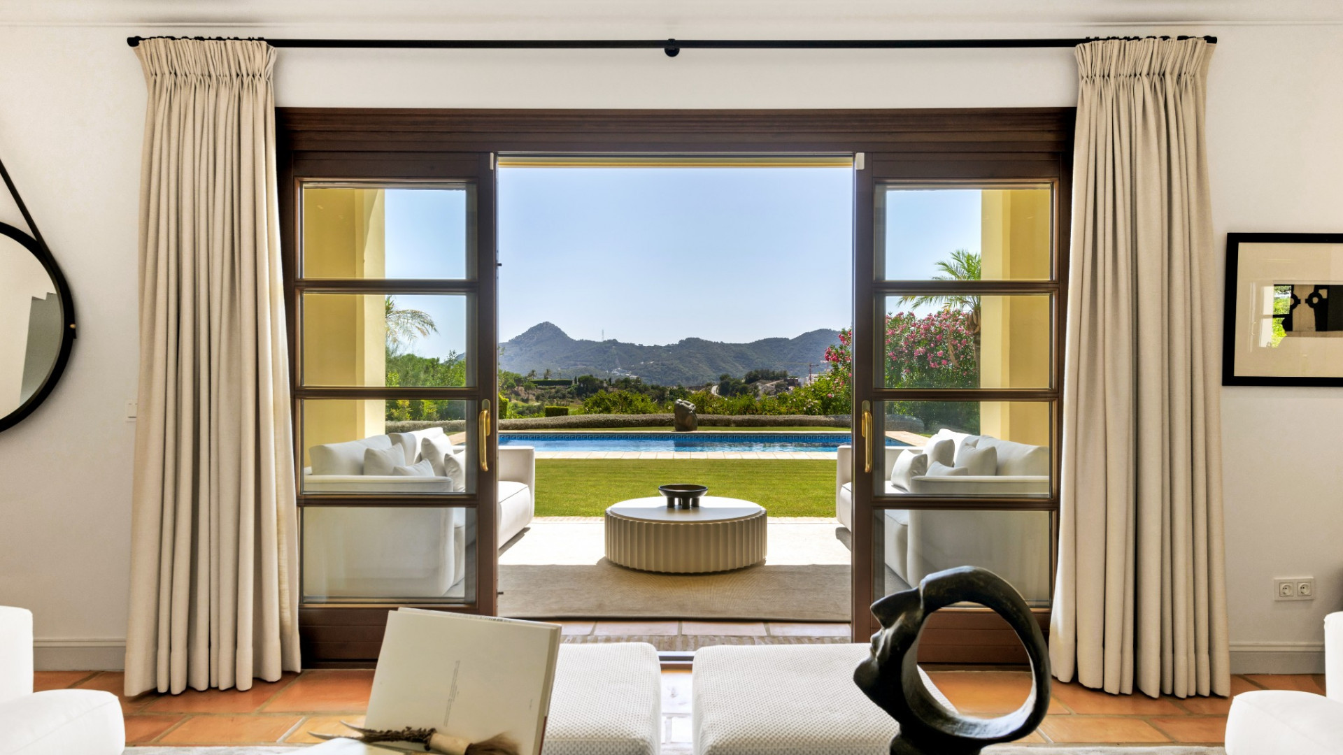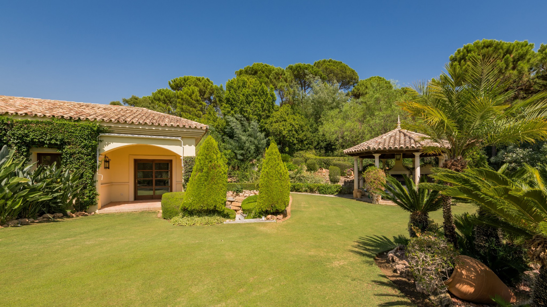 Traditional Andalusian style villa with open mountain views in La Zagaleta golf and country club, ones of Europe’s most exclusive residential complexes. It has 2 gated entrances with 24-hour security, two 18-hole golf courses with club houses, equestrian centre, heliport, racquets club and concierge services for its residents. A former hunting reserve, La Zagaleta spans over 900 hectares maintaining its natural surroundings with golf and sea views. The property is conveniently distributed over two floors plus basement and comprises an entrance hall, a living room with a fireplace leading out to the semi covered terrace with pool and garden views, an adjoining TV room, separate formal dining room with gabled ceilings decorated with wooden beams and a fully fitted kitchen with central island. Two en-suite bedrooms make up this floor, one of them with direct access to the covered terrace and garden. Upper floor is for the exclusive use of master bedroom with a nice dressing area and an spacious bathroom. At the basement there is the staff or guest apartment, this separate space is perfect for accommodating any live-in staff or guests, providing them with their own privacy and convenience. Also, wine cellar, utility room, big storage room, a large multifunctional room (to be converted into cinema room, gymnasium or spa) and spacious garage for 2-3 cars. As we step outside, you’ll be greeted by the enticing poolside area. The shimmering pool is an excellent place to relax and unwind on sunny days, and the gazebo offers the perfect spot for entertaining guests. Whether it’s a casual barbecue or a gathering with friends, the gazebo is equipped with a built-in barbecue, sink and cupboards, making hosting a breeze. The living spaces have been meticulously designed with terracotta floors, giving the home a warm and inviting ambiance. The wooden sliding double glazed windows not only provide excellent insulation but also allow you to enjoy the breathtaking views of the mountains, golf course, and countryside from every corner of the house.