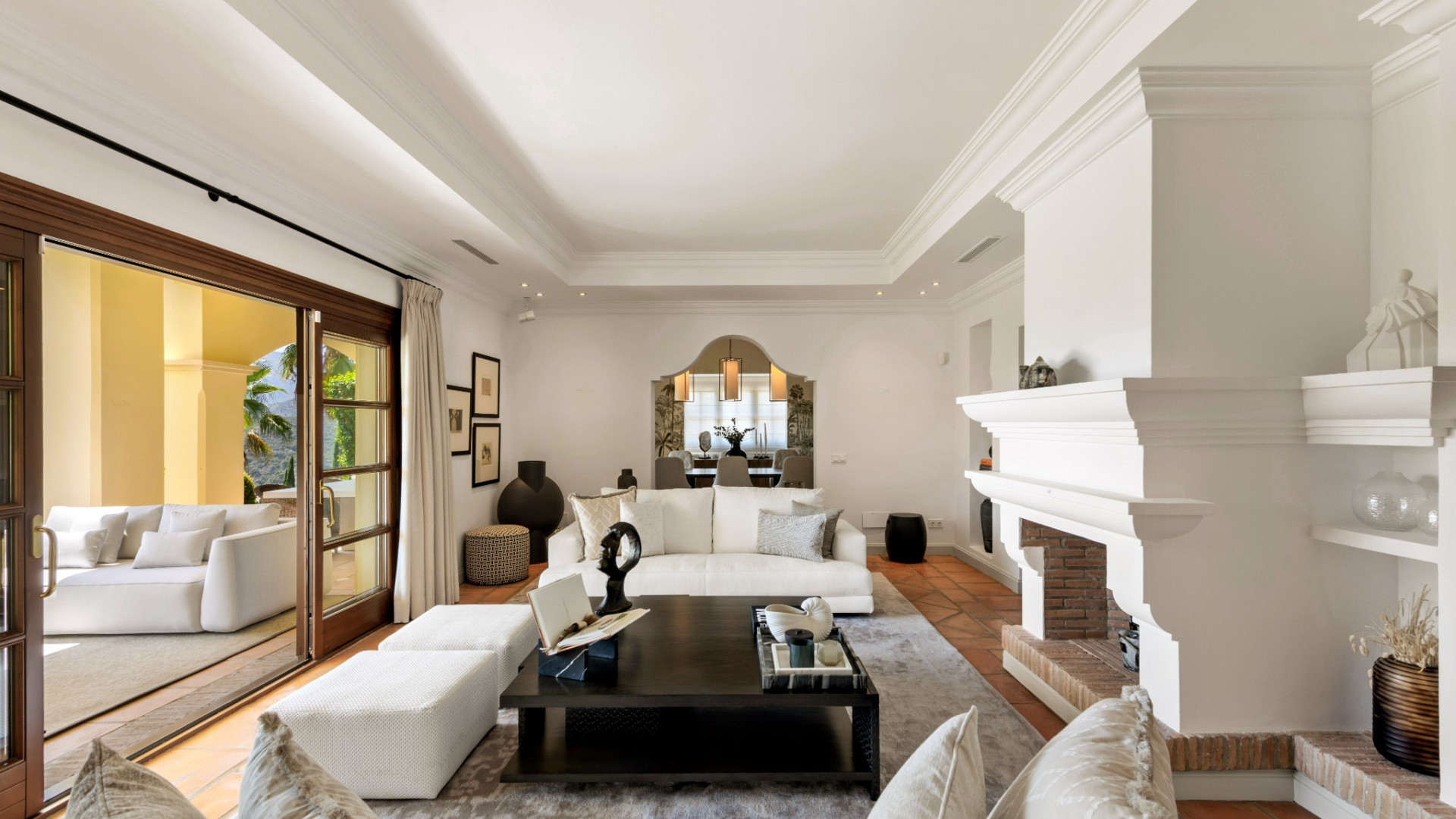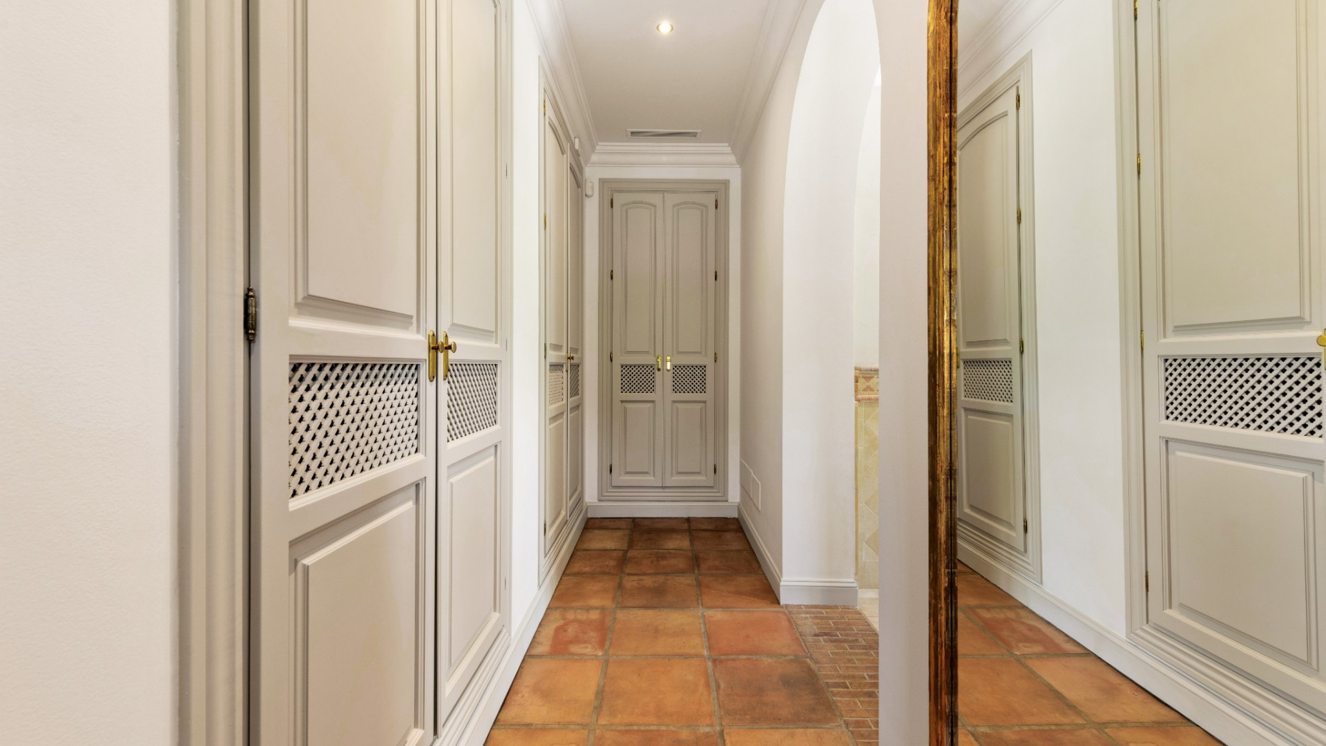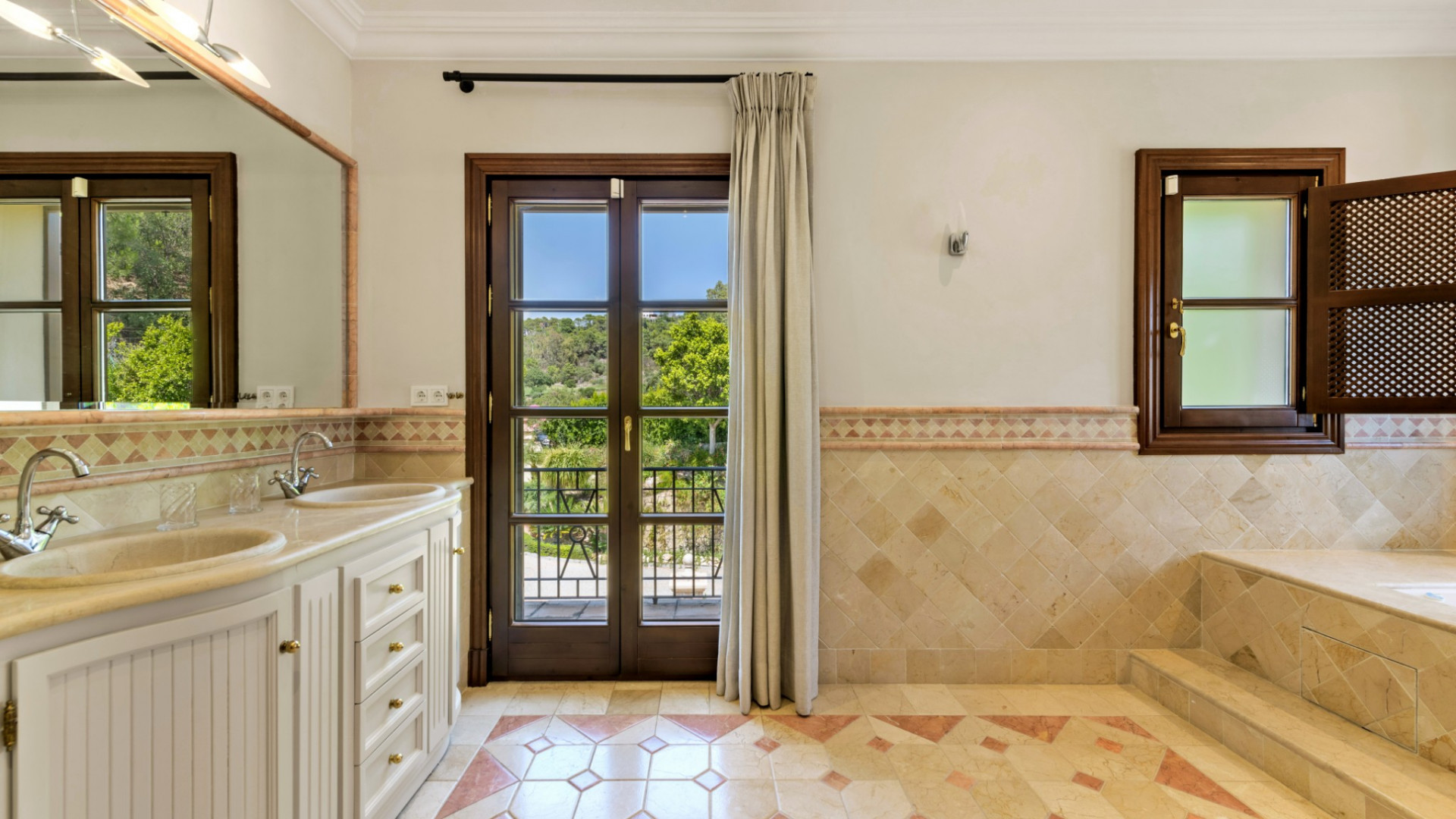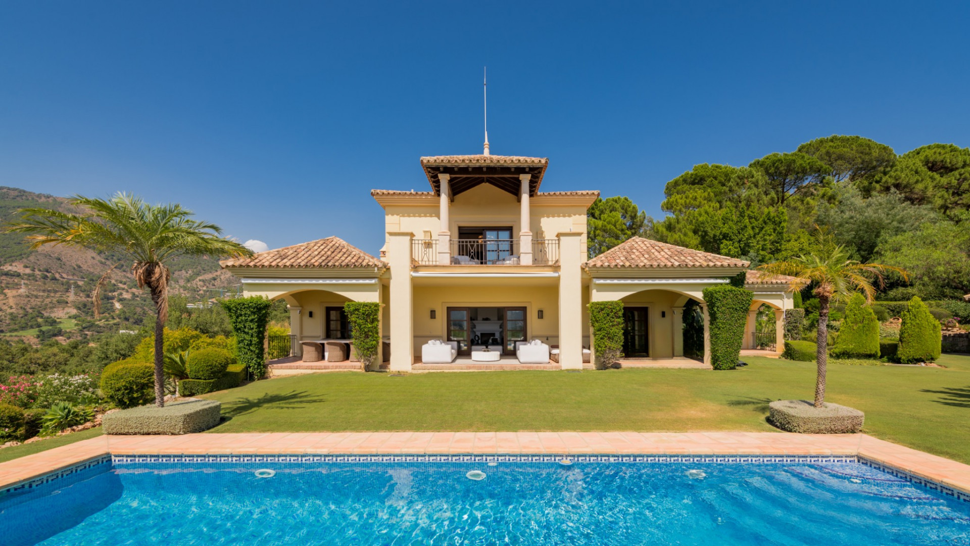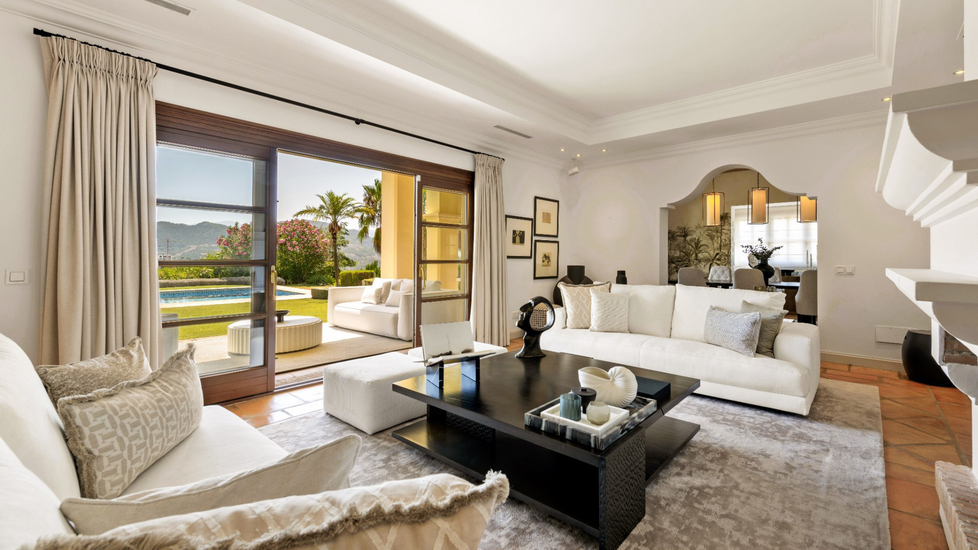 Traditional Andalusian style villa with open mountain views in La Zagaleta golf and country club, ones of Europe’s most exclusive residential complexes. It has 2 gated entrances with 24-hour security, two 18-hole golf courses with club houses, equestrian centre, heliport, racquets club and concierge services for its residents. A former hunting reserve, La Zagaleta spans over 900 hectares maintaining its natural surroundings with golf and sea views. The property is conveniently distributed over two floors plus basement and comprises an entrance hall, a living room with a fireplace leading out to the semi covered terrace with pool and garden views, an adjoining TV room, separate formal dining room with gabled ceilings decorated with wooden beams and a fully fitted kitchen with central island. Two en-suite bedrooms make up this floor, one of them with direct access to the covered terrace and garden. Upper floor is for the exclusive use of master bedroom with a nice dressing area and an spacious bathroom. At the basement there is the staff or guest apartment, this separate space is perfect for accommodating any live-in staff or guests, providing them with their own privacy and convenience. Also, wine cellar, utility room, big storage room, a large multifunctional room (to be converted into cinema room, gymnasium or spa) and spacious garage for 2-3 cars. As we step outside, you’ll be greeted by the enticing poolside area. The shimmering pool is an excellent place to relax and unwind on sunny days, and the gazebo offers the perfect spot for entertaining guests. Whether it’s a casual barbecue or a gathering with friends, the gazebo is equipped with a built-in barbecue, sink and cupboards, making hosting a breeze. The living spaces have been meticulously designed with terracotta floors, giving the home a warm and inviting ambiance. The wooden sliding double glazed windows not only provide excellent insulation but also allow you to enjoy the breathtaking views of the mountains, golf course, and countryside from every corner of the house.