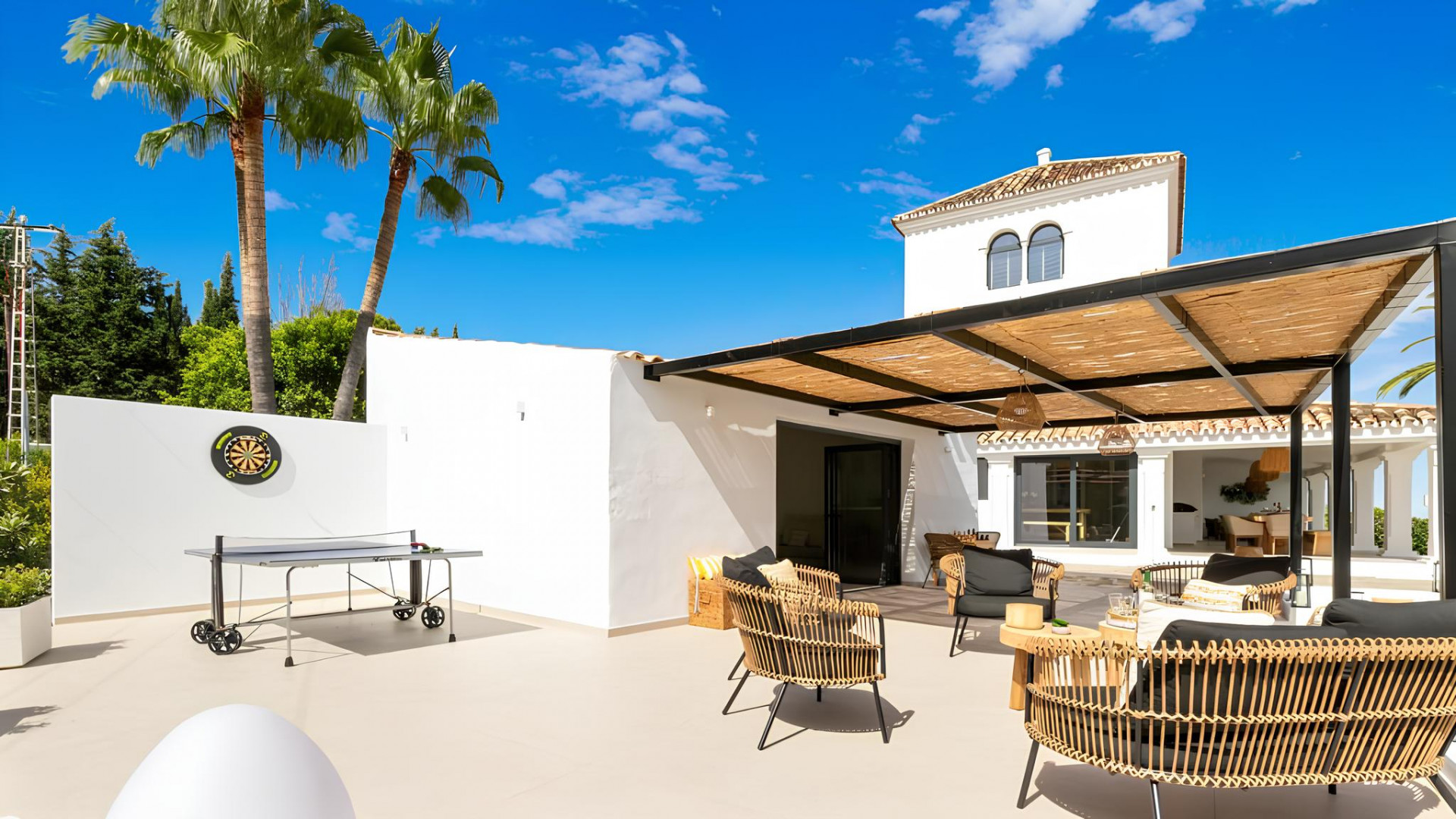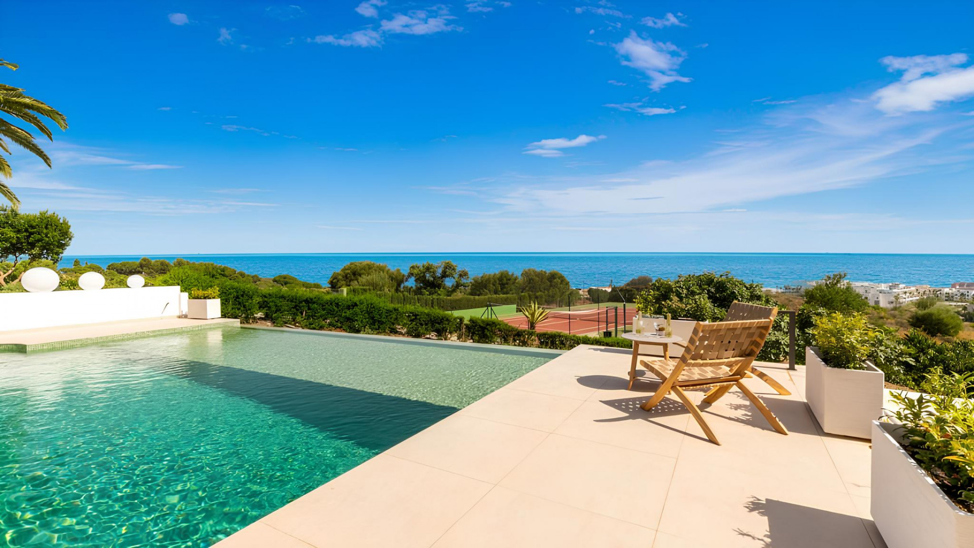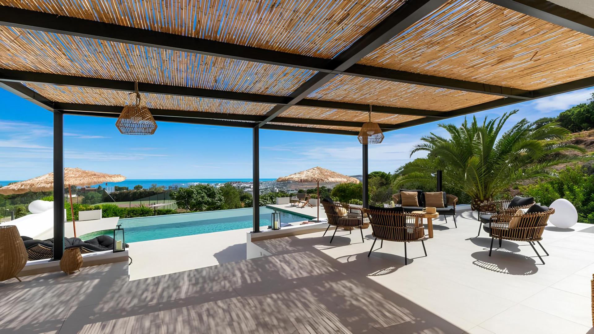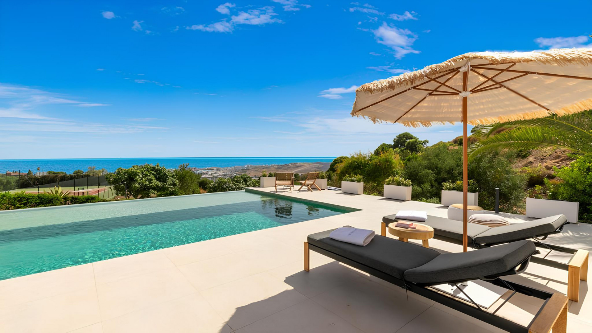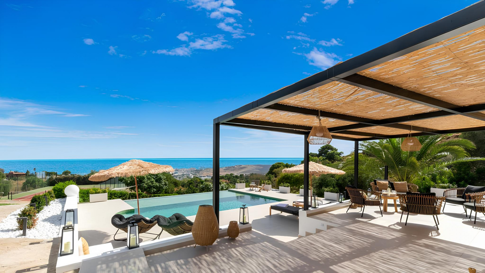 Discover an exquisite villa, recently renovated to perfection, offering breathtaking panoramic views. Nestled within a 5000m2 parcel in Estepona, this revitalized home defines quality and presents an array of exceptional features. The main residence includes 4 bedrooms and 4 bathrooms, while a separate guest house offers 1 bedroom, a bathroom, and a private kitchenette. Additional amenities comprise a pool house, two-car garage, dedicated laundry, and a splendid tennis court, ensuring ample leisure and comfort. The allure lies in unobstructed sea, Gibraltar, Estepona, and port views from every room and outdoor space, complemented by a covered terrace and open lounging areas around the pool. Meticulously renewed with premium Northern European materials, this villa showcases a wood-burning fireplace, Gaggenau appliances, and a master suite. Experience this distinctive property firsthand to truly appreciate its exceptional craftsmanship and extraordinary surroundings.