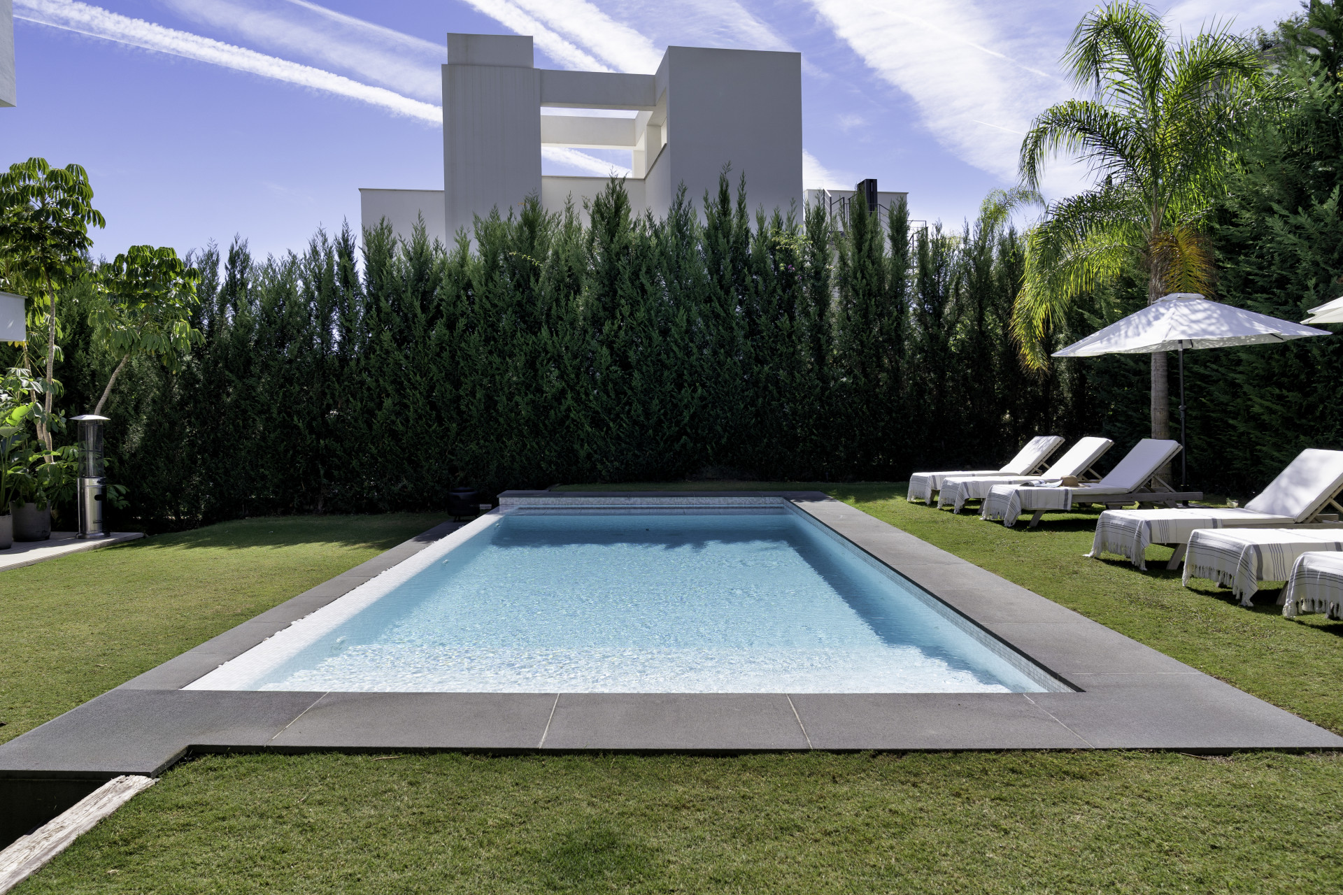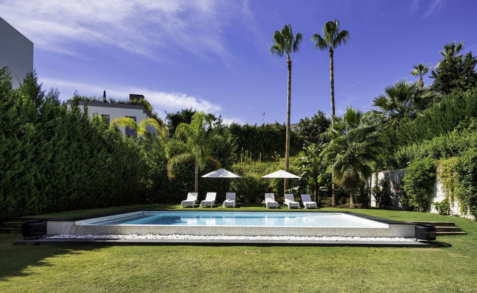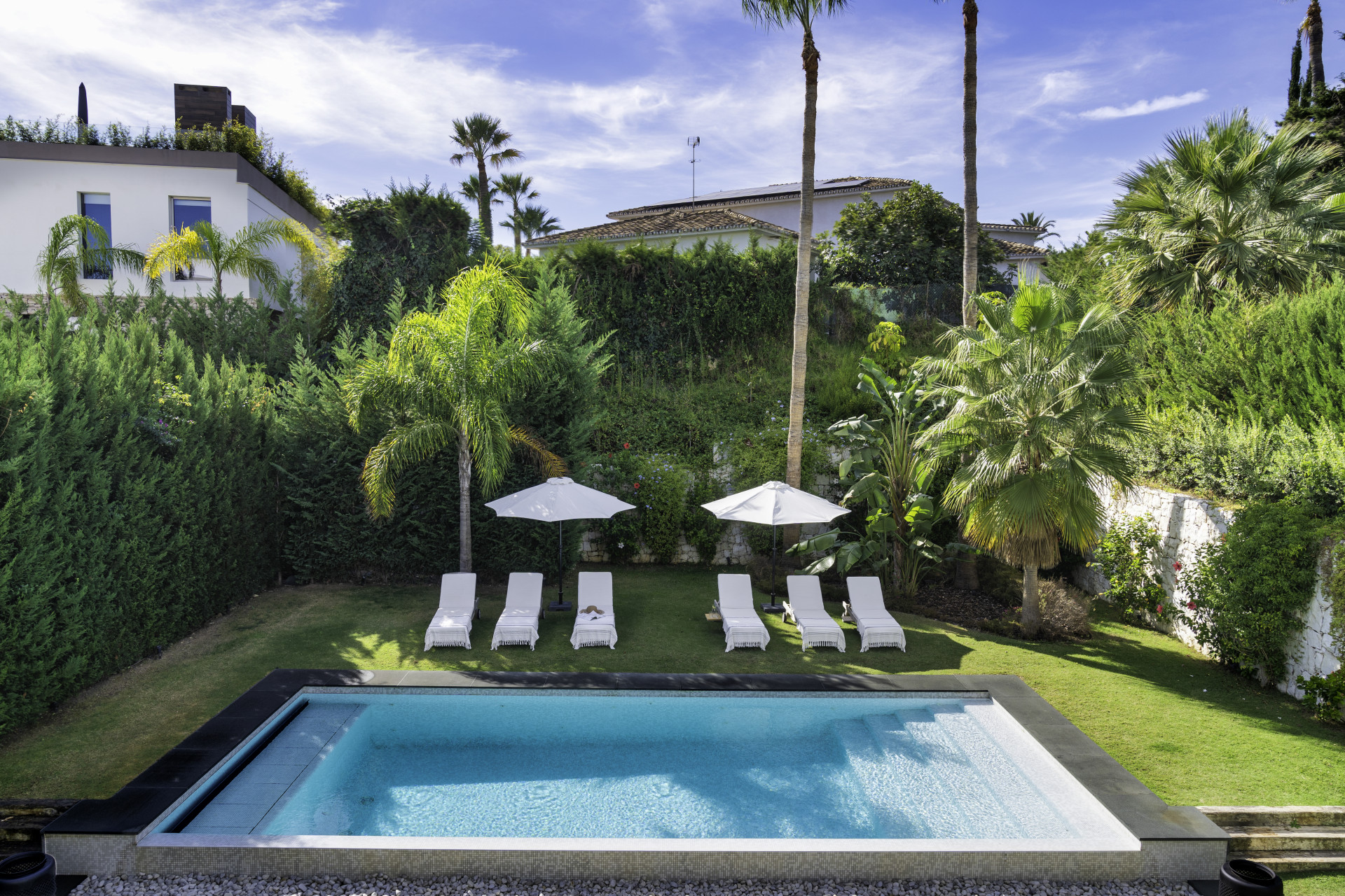 Externally, Villa Gardenias captivates with a luxurious rooftop terrace, boasting an outdoor kitchen and jacuzzi. The expansive garden, with its private heated pool, is a haven of serenity, bordered by lush hedges and palms.