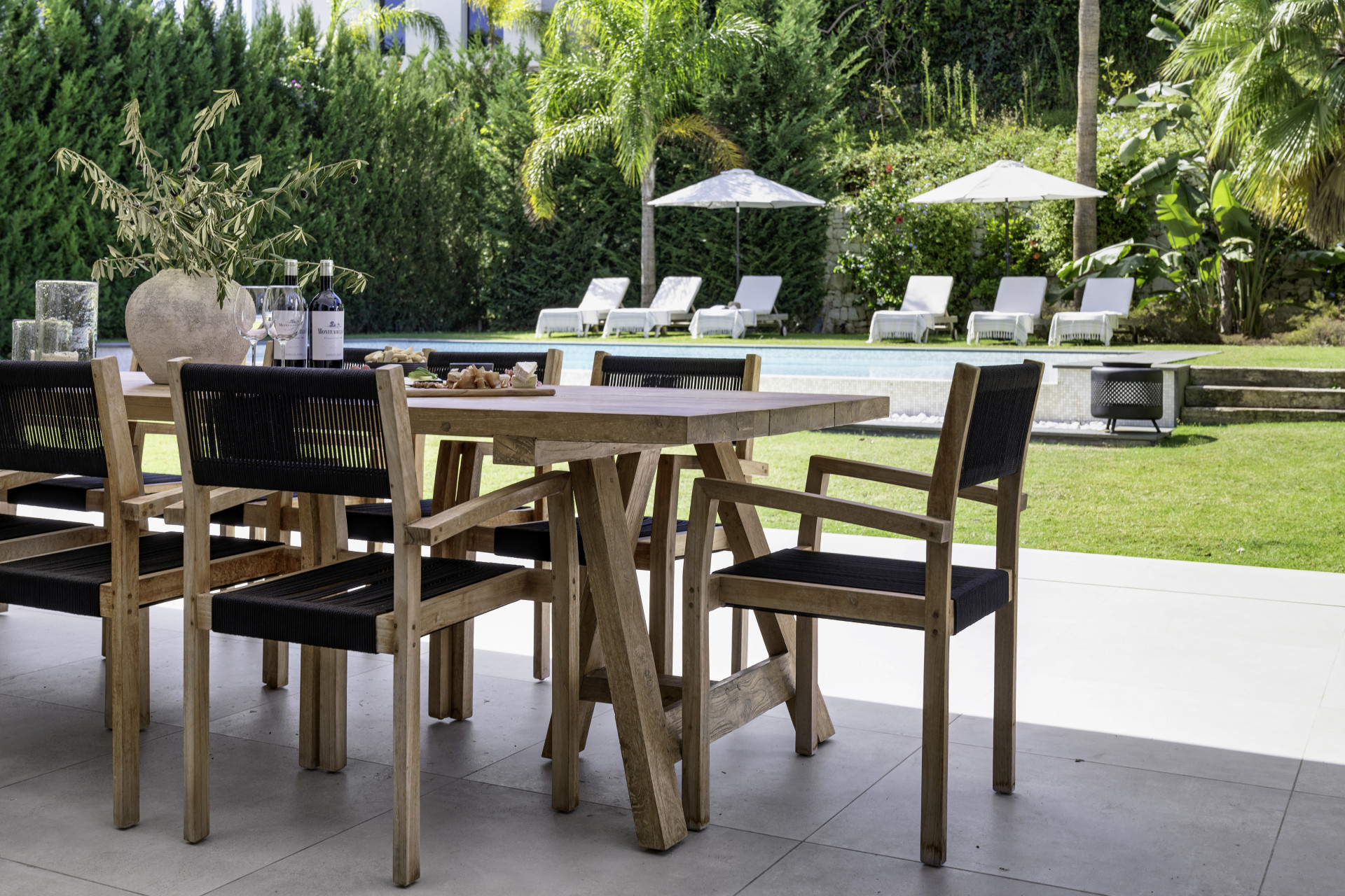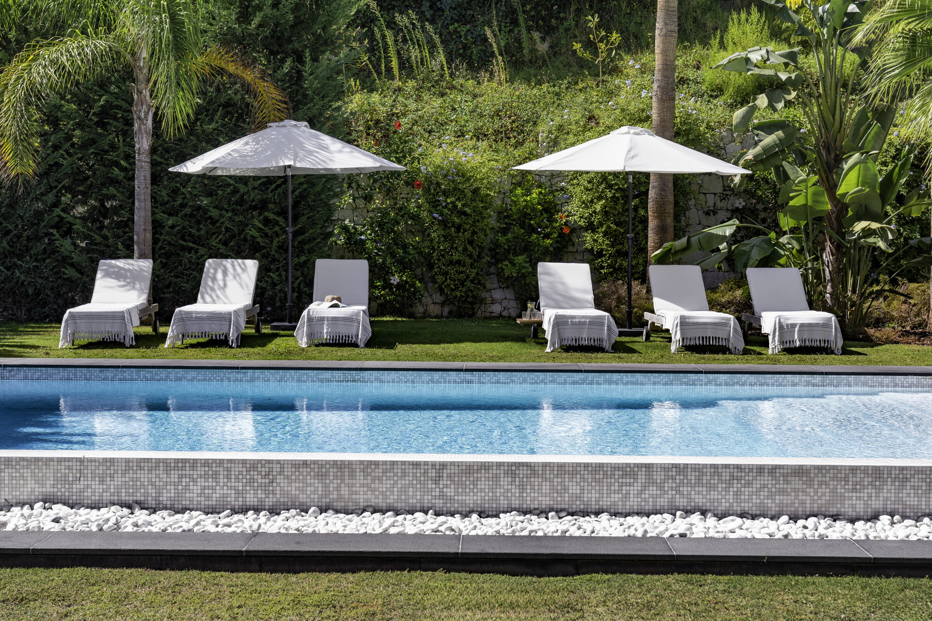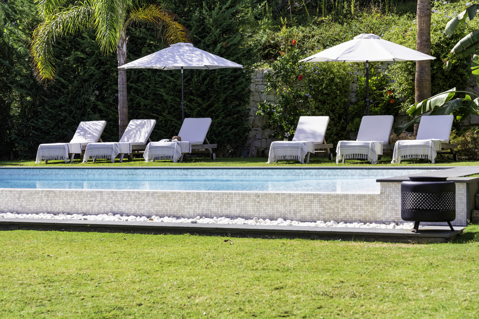 Externally, Villa Gardenias captivates with a luxurious rooftop terrace, boasting an outdoor kitchen and jacuzzi. The expansive garden, with its private heated pool, is a haven of serenity, bordered by lush hedges and palms.