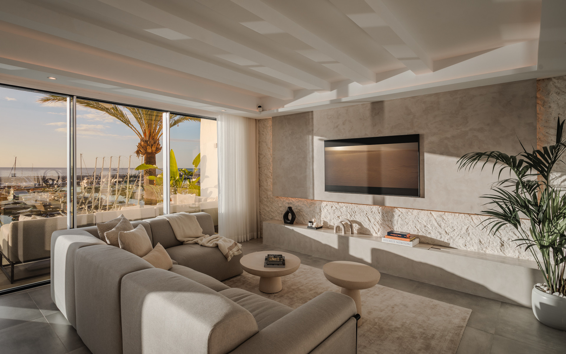 A bright and spacious duplex penthouse on the front line in Puerto Banús designed and decorated by one of Marbella’s leading architects. The property consists of large and bright living room with cream marble floors and feature lighting, a very spacious master en-suite bedroom with walk-in wardrobe and stunning sea views. There are two further en-suite double bedrooms, plus a further guest bedroom with separate bathroom; a fully fitted kitchen with high quality appliances and plenty of cupboards and storage space. The property also features an amazing terrace with stunning views over the boats and sea. The property is fully furnished. It has just been fully renovated and redesigned to top quality specifications. Included in the price there´s a 10 year free port pass.