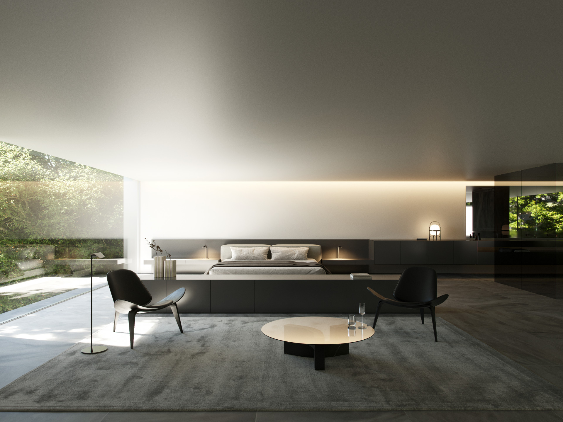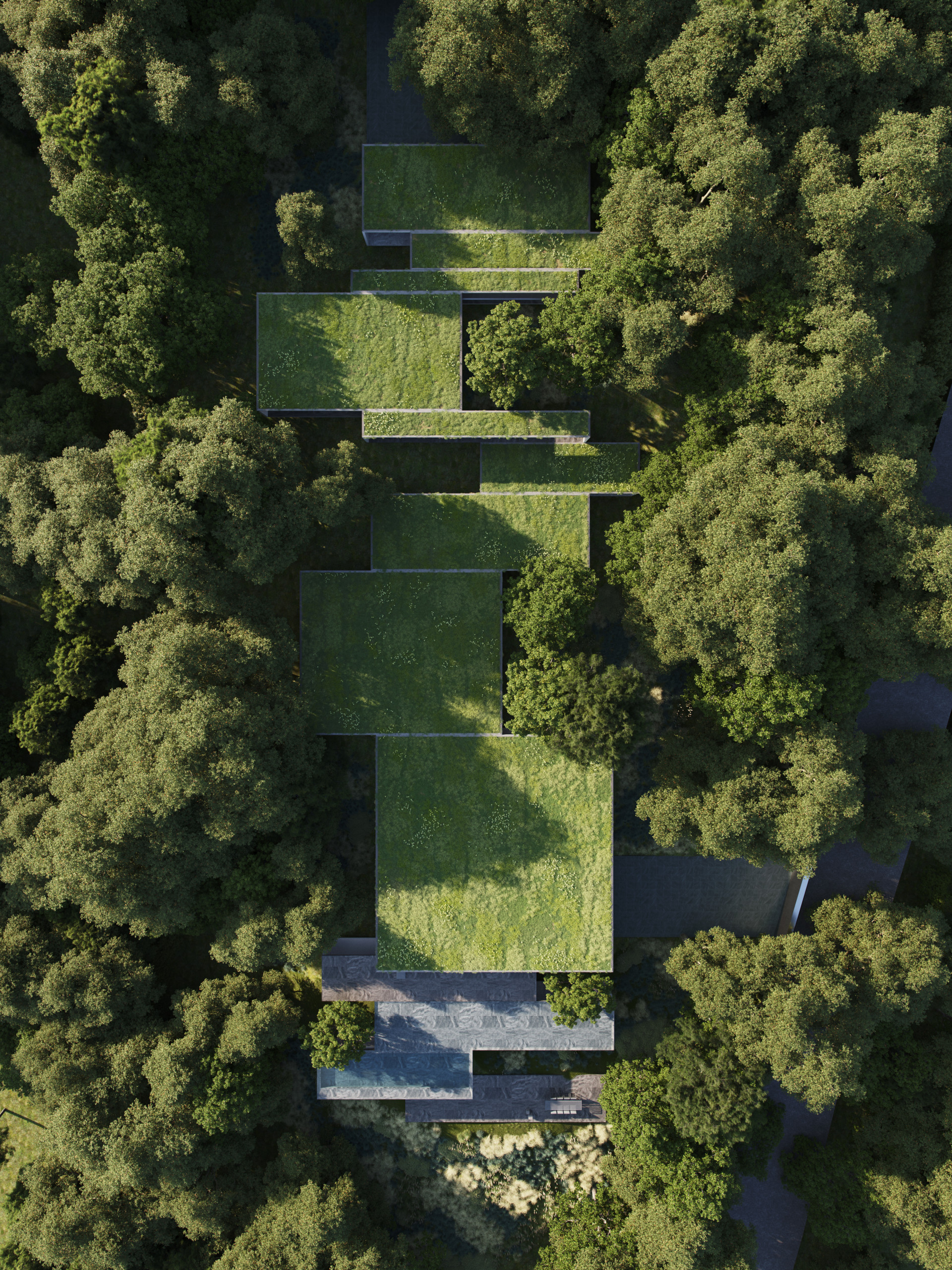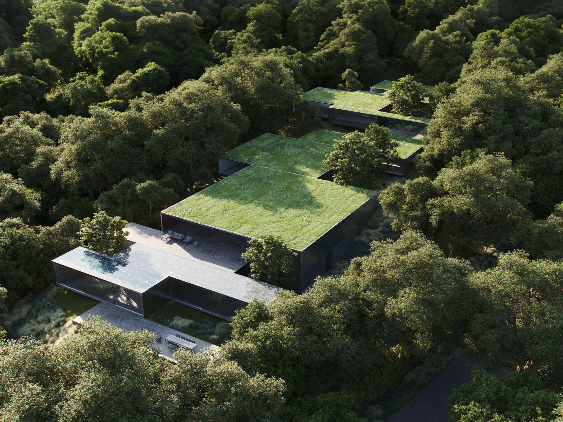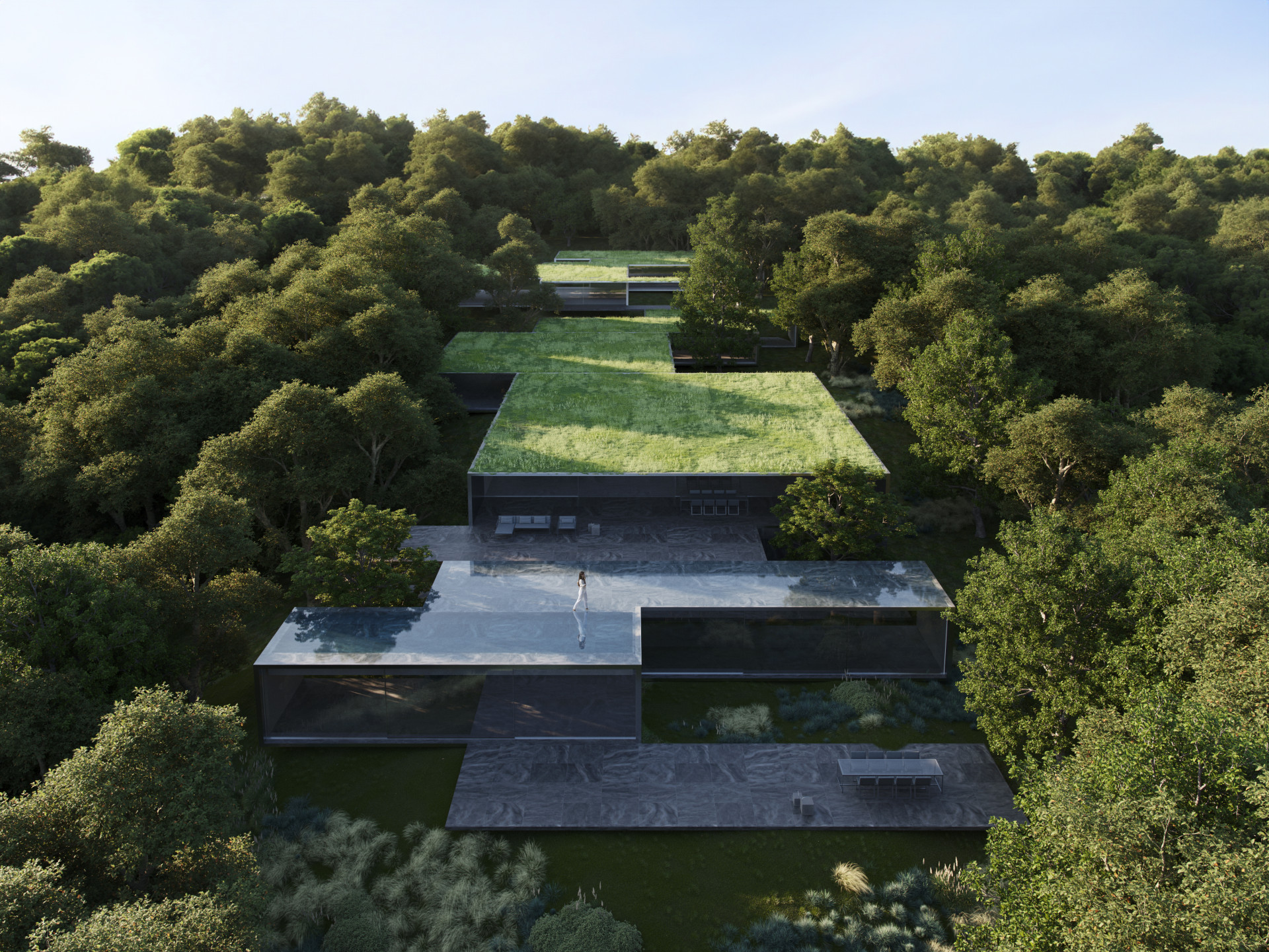 The architecture of Villa 59 blends with the natural topography, featuring elongated and sloping structures creating a perfect transition between the villa and its wooded surroundings. The villa has a zero-energy consumption design seamlessly integrating renewable energy sources to ensure complete self-sufficiency without compromising comfort or aesthetics.
