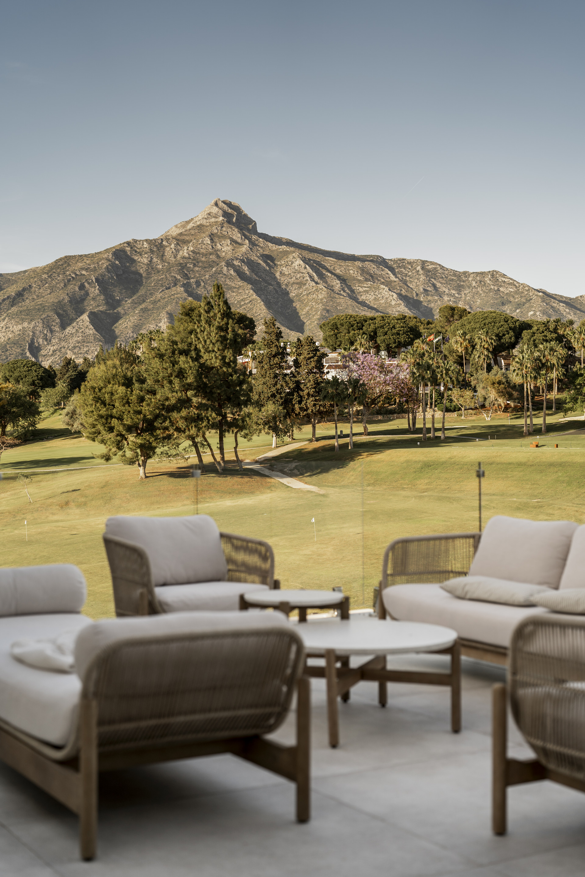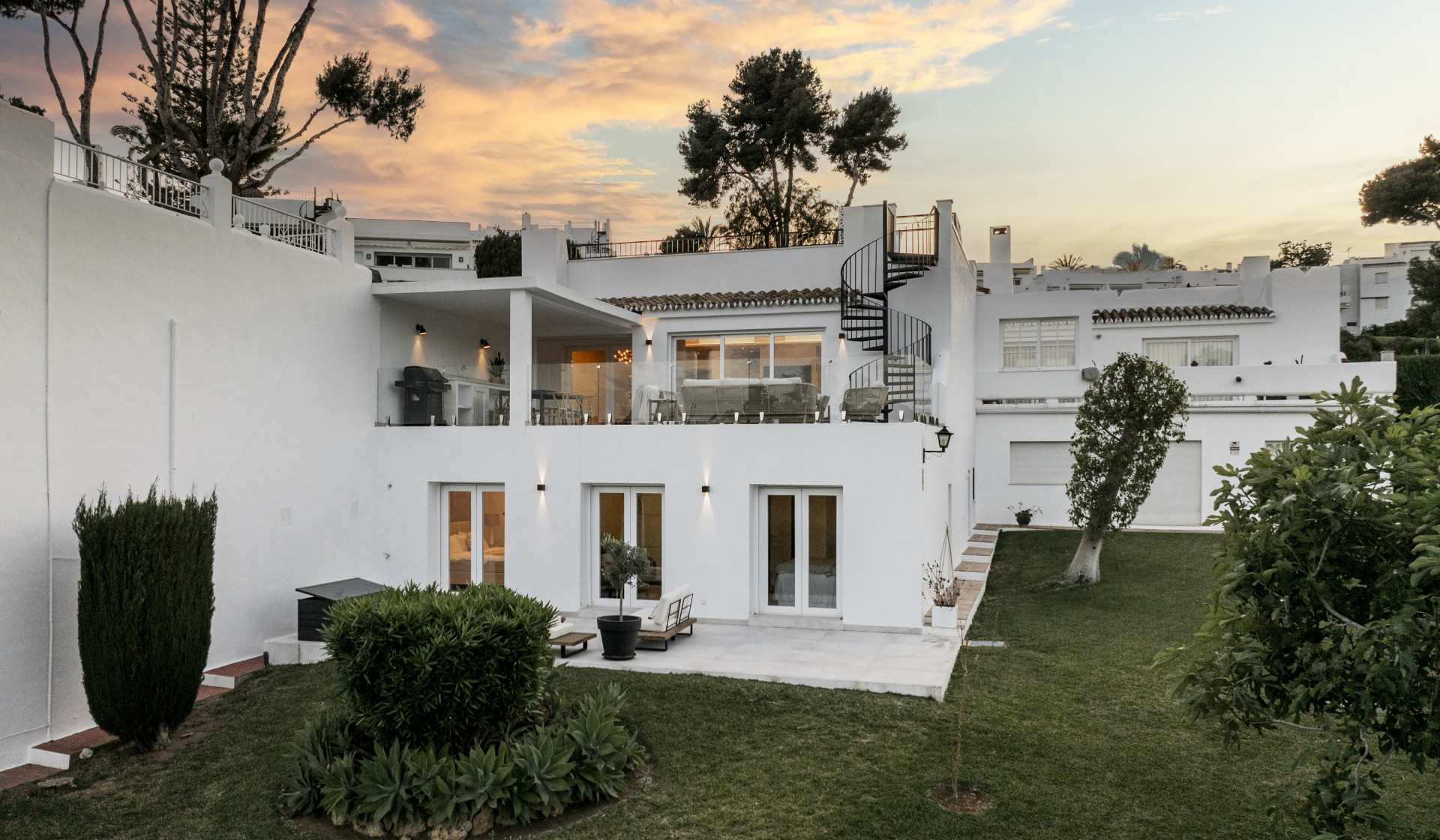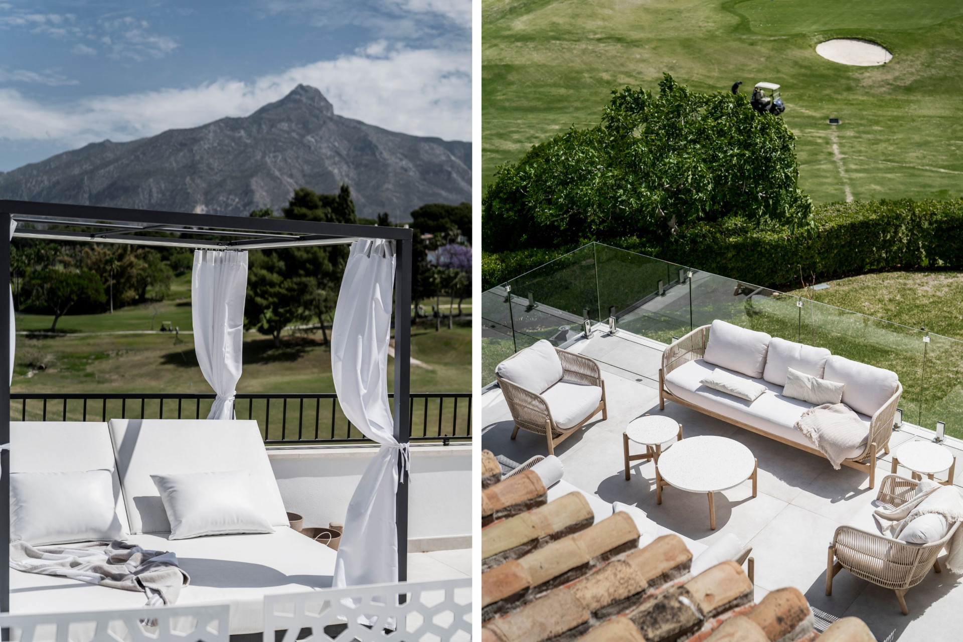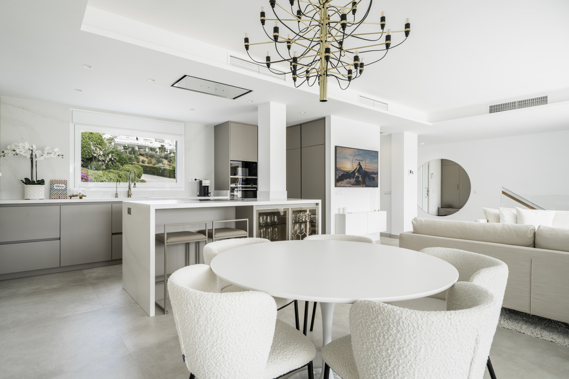 The beauty of simplicity shines through in Azahara II a retreat nestled in the neighborhood of Nueva Andalucía. This haven embodies the essence of Leonardo Da Vincis timeless words. Designed for living it offers space, for both indoor and outdoor enjoyment. Step outside to find a terrace with a covered gallery for hosting unforgettable al fresco barbecues while enjoying views of the golf course. A cozy living area by the lawn beckons relaxation while a sun deck provides the spot for soaking up the Mediterranean sun. The residence boasts lines and large windows that frame captivating views of Nueva Andalucía showcasing La Concha and Aloha Golfs frontlines. Neutral. Premium materials like marble and wood exude luxury throughout the home. The open layout seamlessly integrates the kitchen with a living and dining area. With 3 bedrooms, 3 bathrooms and an exclusive guest house featuring its kitchen, living space and bathroom Azahara II is ideal for gatherings or private getaways. The communal pool against a backdrop of mountains offers a setting, for relaxation.
