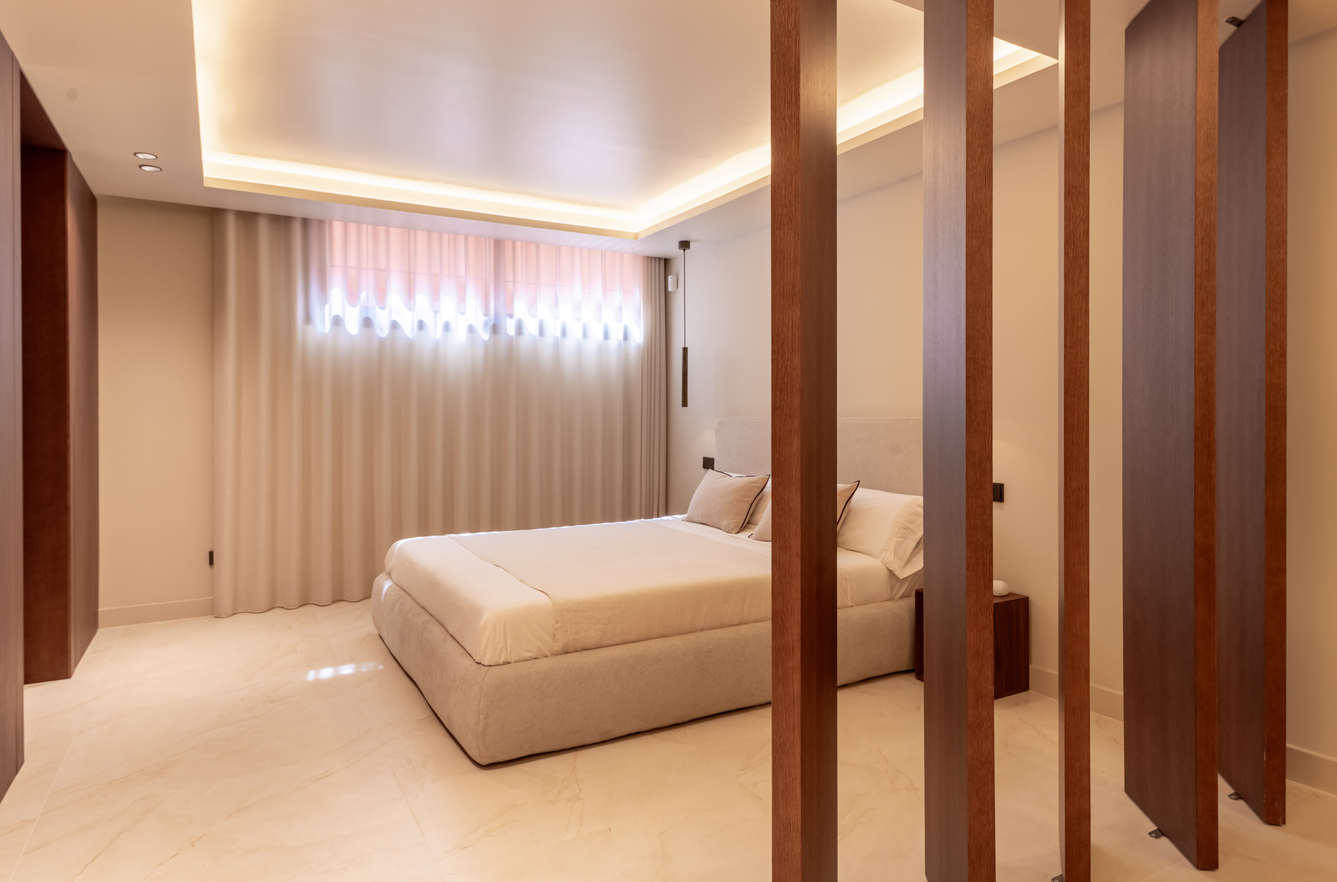 The first floor includes a luxurious principal bedroom with custom-made wooden wardrobes and a private terrace. There are also two additional bedrooms that share a bathroom.