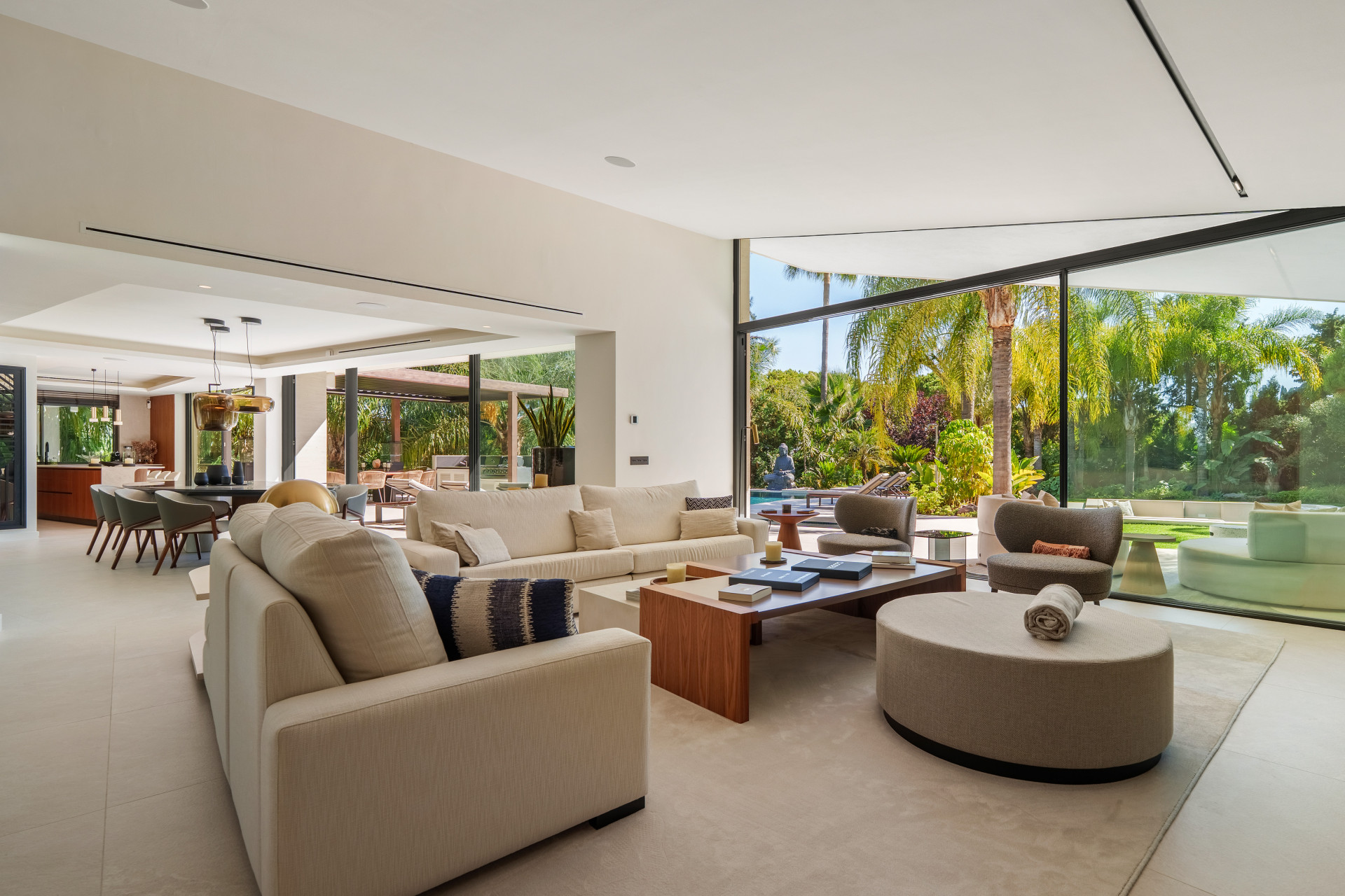 The exterior is defined by its beautifully landscaped gardens and mature palms. The central feature of the outdoor space is the sparkling pool, complete with stepping stones and surrounding sun loungers. The villa also offers multiple spots for relaxation and entertaining, including a covered dining terrace and a sunken firepit lounge with integrated lighting, creating an inviting setting for any time of day or night. The entire design prioritizes privacy while ensuring maximum enjoyment of Marbella’s famous climate.