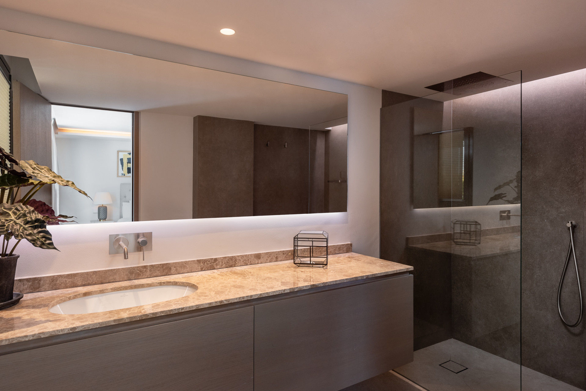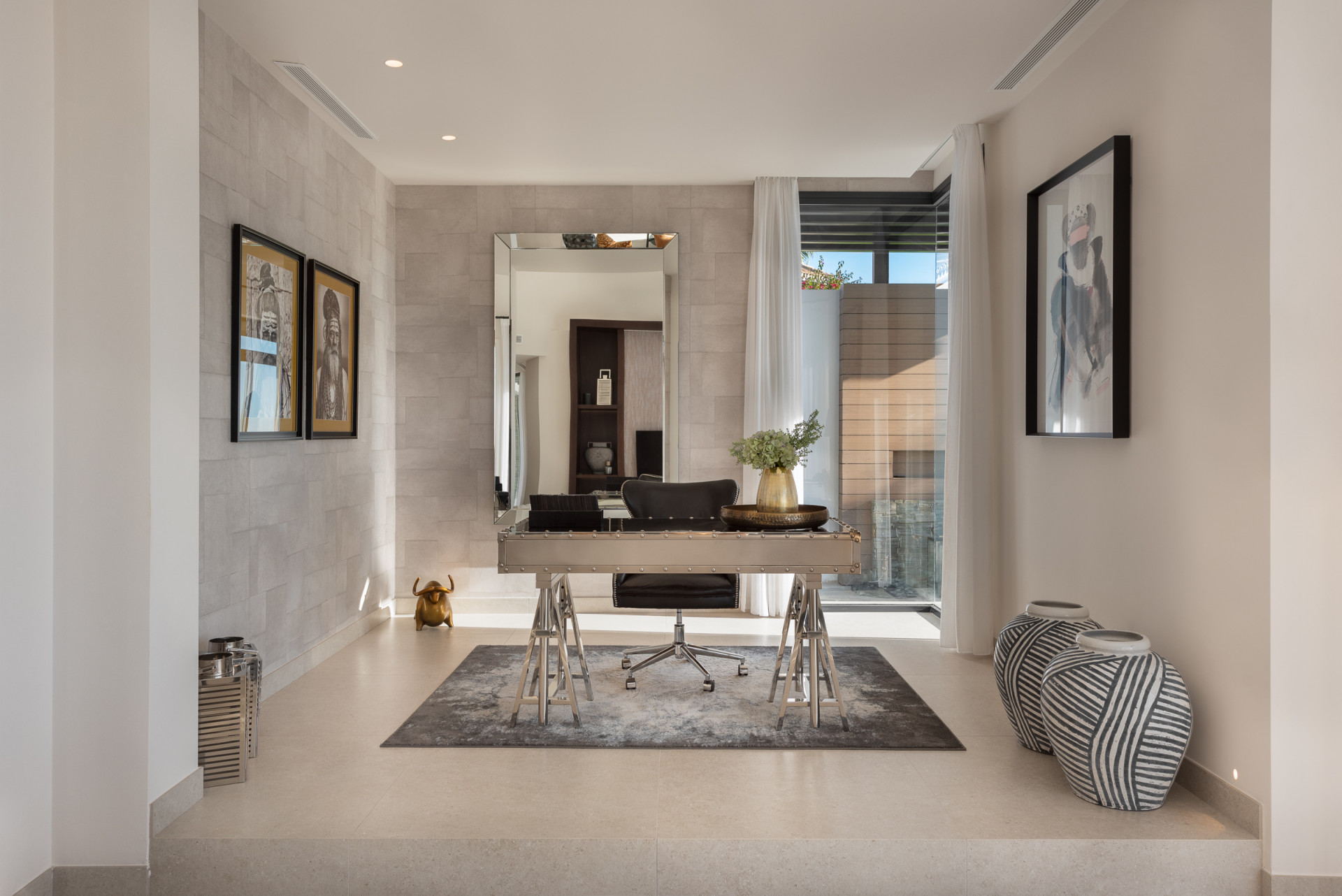 La Villa La Vista allie un design contemporain à des touches andalouses. Sur un terrain de 1 158 m², elle comprend 351 m² d’espace habitable et 135 m² de terrasses, le tout sur un seul niveau. L’espace de vie ouvert dispose d’une télévision Smart TV de 65 pouces, d’une cheminée à l’éthanol et de vues sur le jardin et la montagne La Concha. La cuisine est équipée d’appareils Gaggenau et d’un refroidisseur de vin.