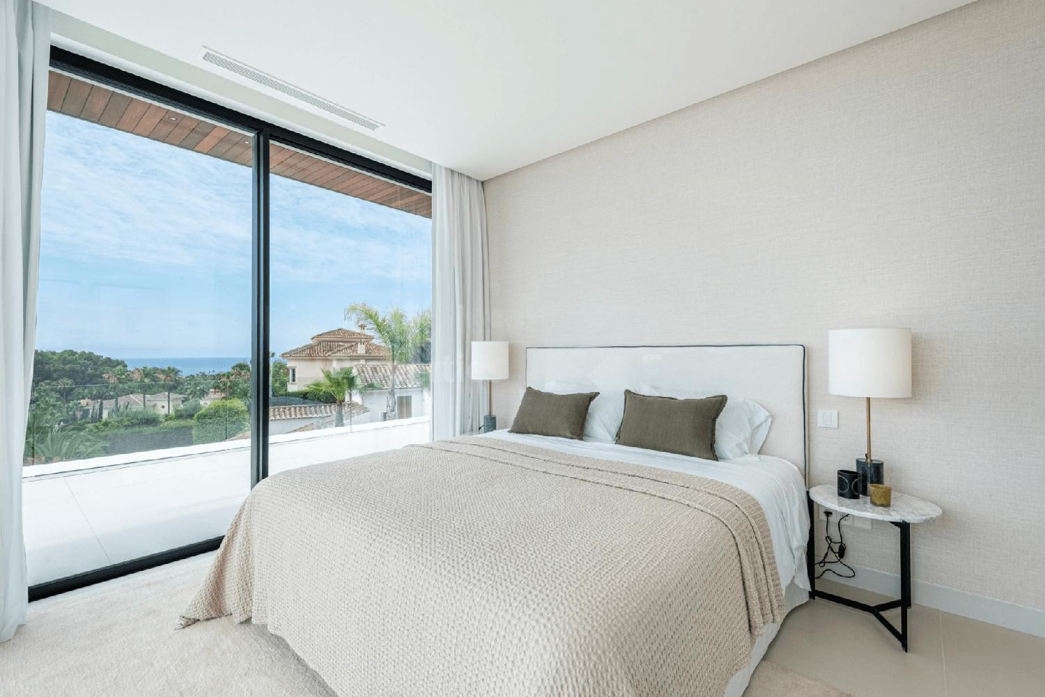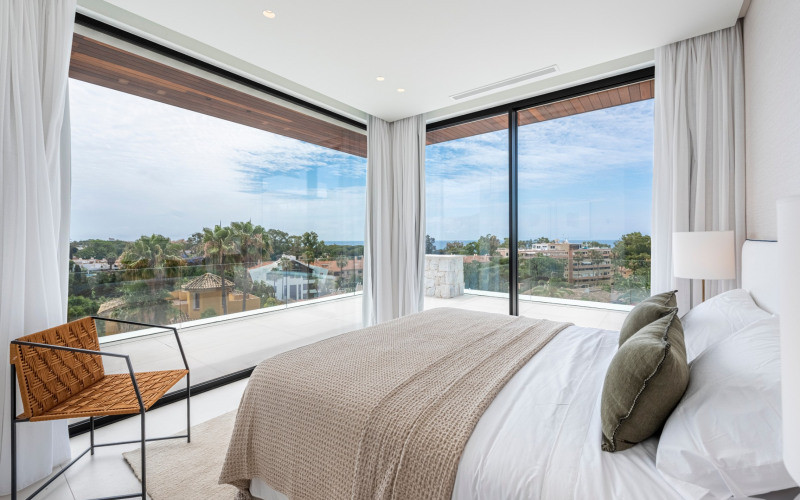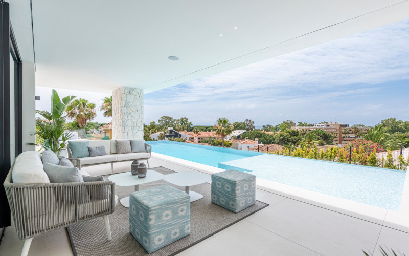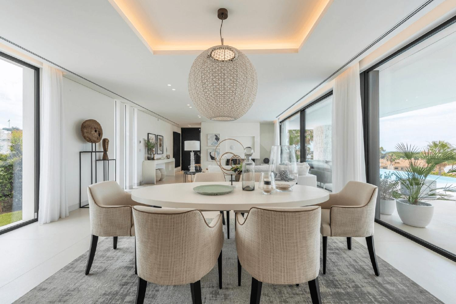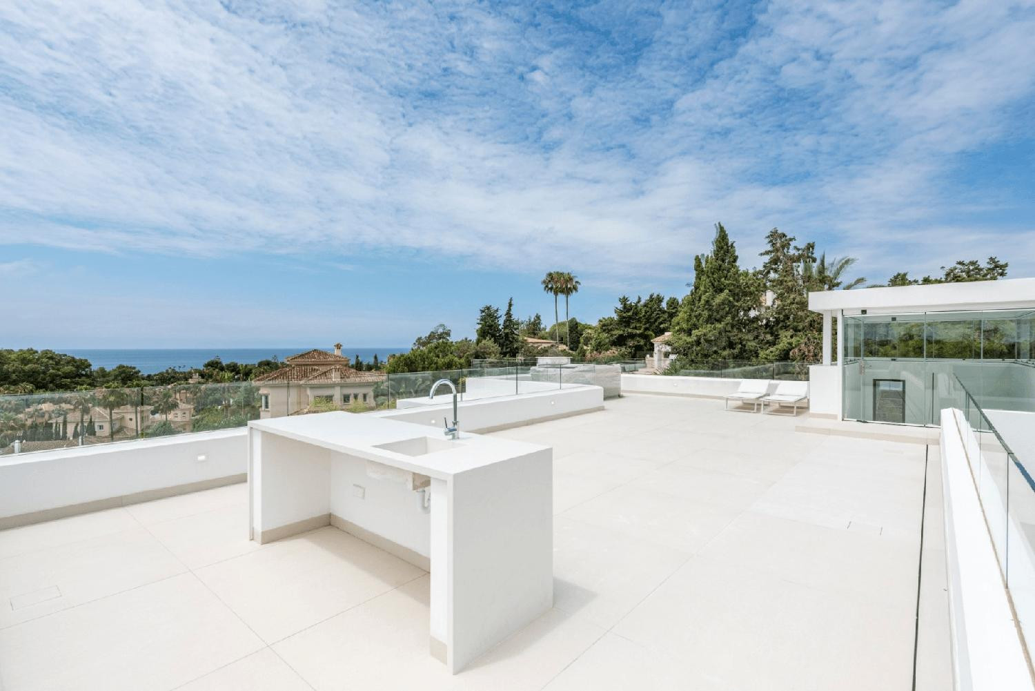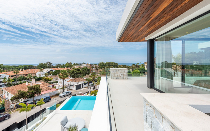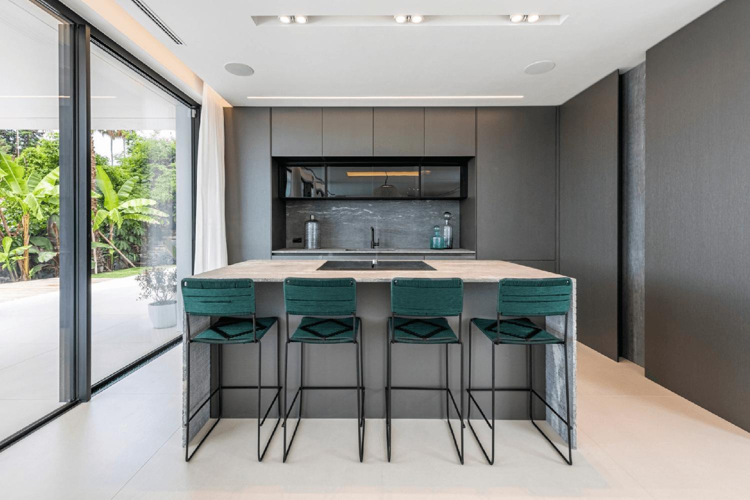 Conçue par l’architecte Carlos Lamas, cette villa dispose d’espaces de vie confortables répartis sur quatre niveaux, dont un sous-sol et une terrasse sur le toit. Le niveau principal comprend une salle de bain pour les invités, un espace combiné salon/salle à manger avec une cuisine ouverte équipée d’appareils Gaggenau haut de gamme et d’un îlot central. Le salon donne sur une terrasse couverte avec une piscine qui permet de prendre des bains de soleil, de manger en plein air et de se réunir. L’étage abrite trois chambres à coucher, chacune ayant accès à un balcon offrant une vue captivante sur la mer.