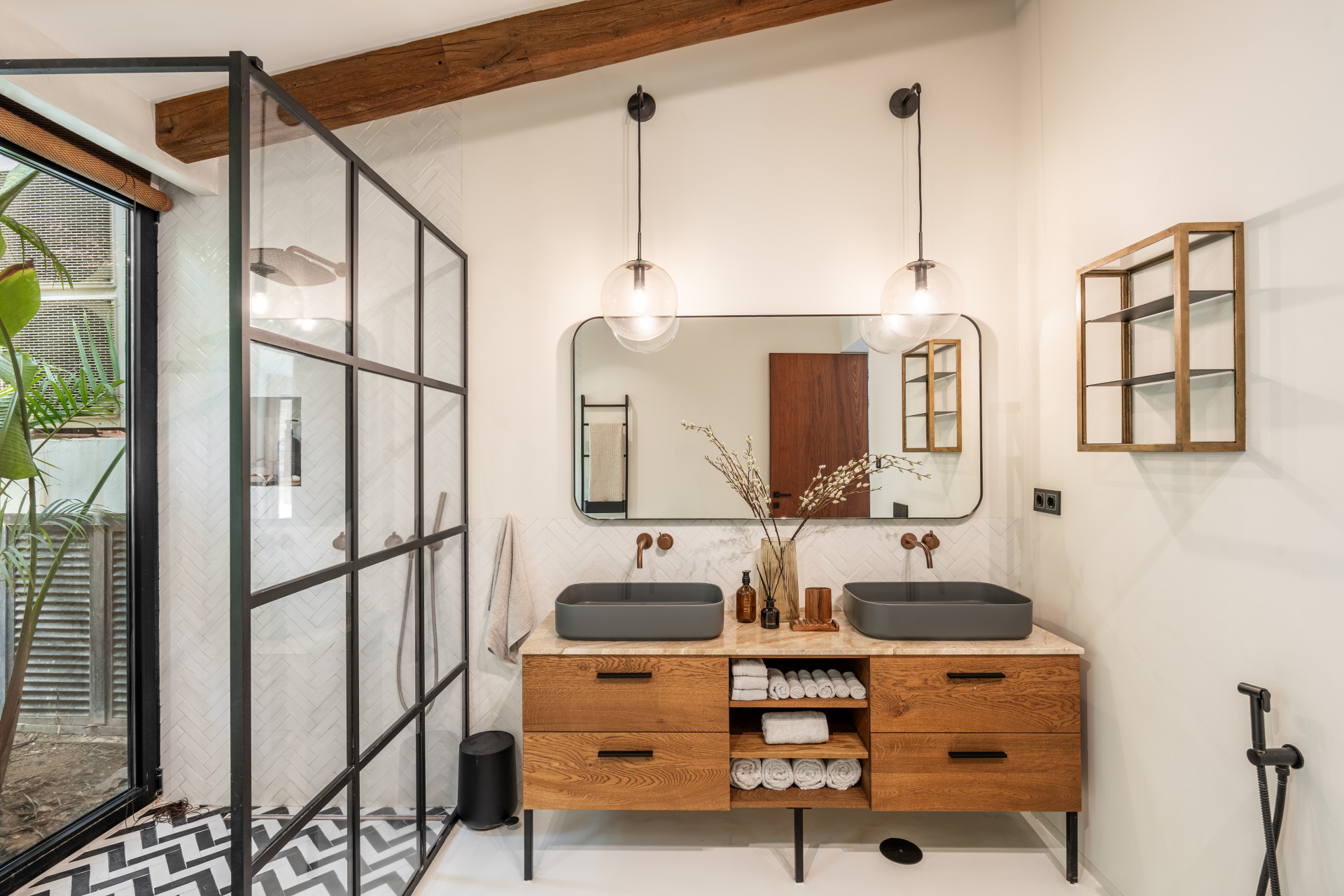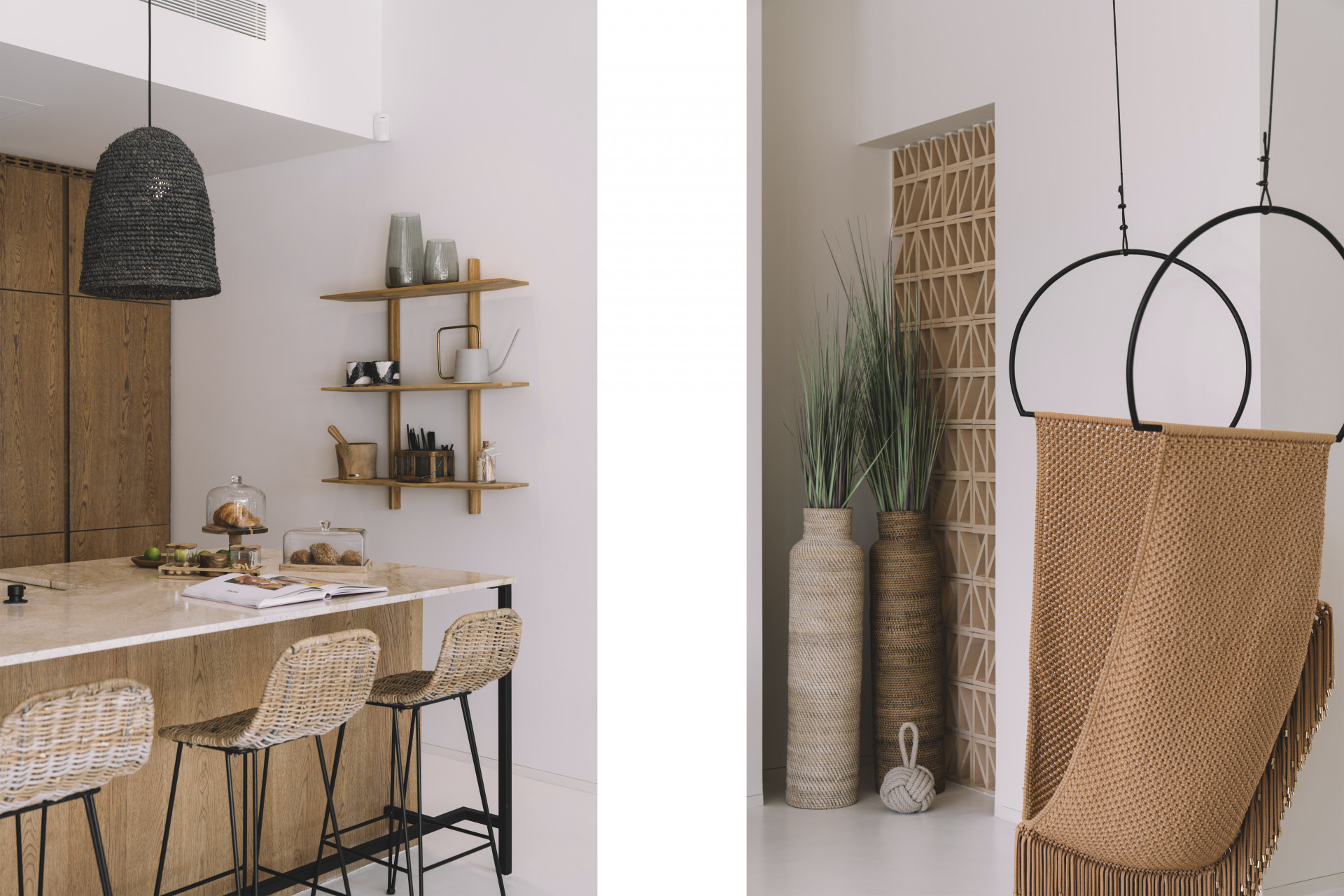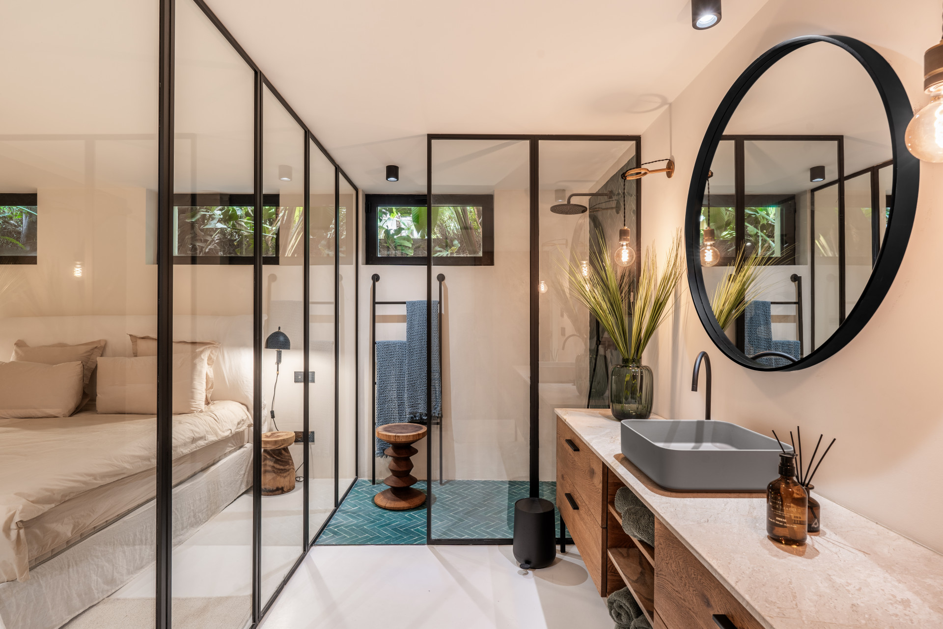 La villa est ouverte et élégante à l’intérieur, avec des sols et des murs étincelants parfaitement assortis, de hauts plafonds ornés de poutres en bois et de grandes fenêtres partout. Même dans les salles de bains ! Elles offrent un aperçu de la nature tout en préservant l’intimité. Au rez-de-chaussée se trouve un salon qui s’ouvre sur une cuisine ouverte dotée d’un bar et d’une salle à manger ; il y a également un coin salon confortable, rendu accueillant par une cheminée suspendue, qui se connecte parfaitement à la terrasse extérieure. En outre, il y a une salle d’eau pour les invités et trois chambres avec salle de bains, dont une luxueuse suite parentale qui comprend une salle de bains spacieuse avec une baignoire et une douche, ainsi qu’un élégant dressing fermé par une vitre.