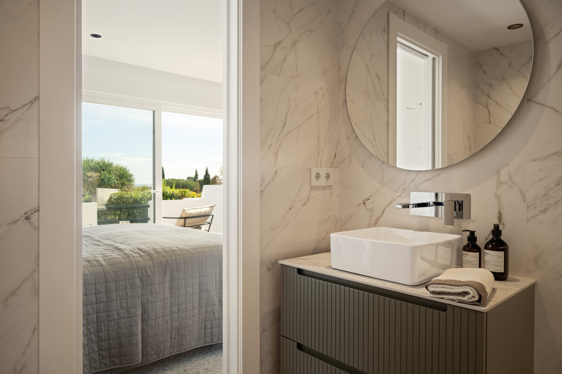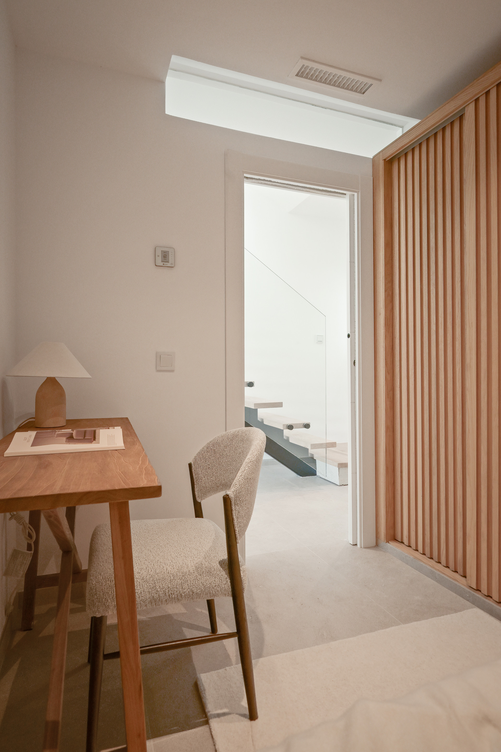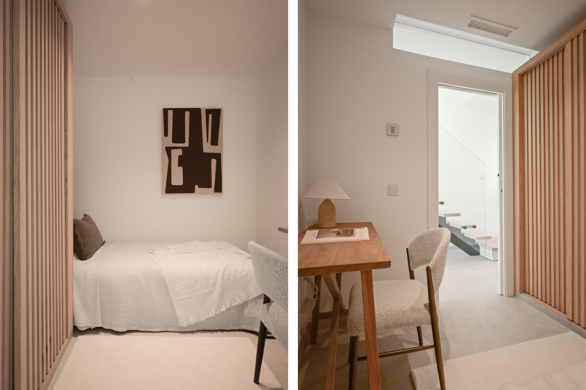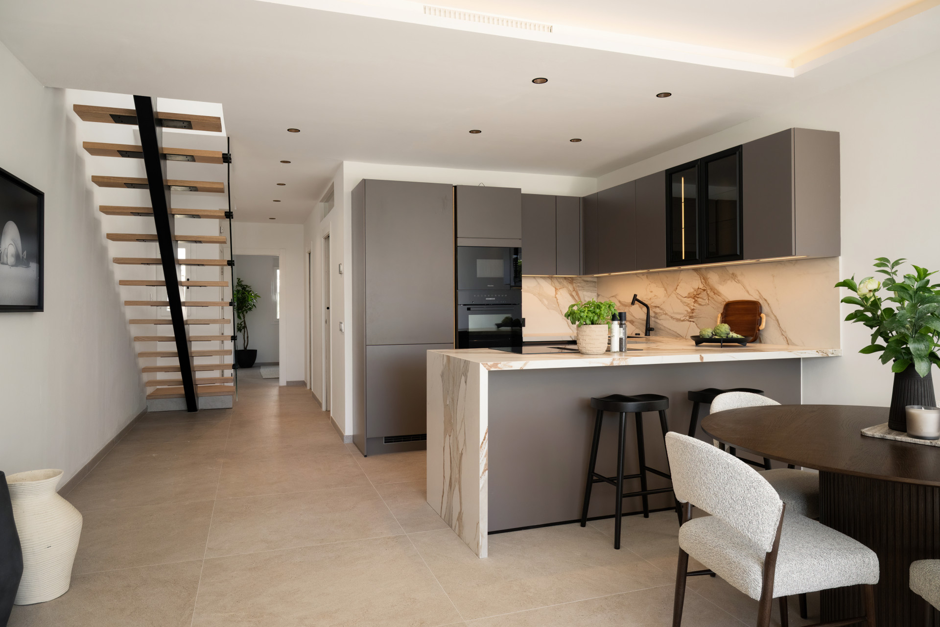 Algarrobos 53 est une maison de ville entièrement rénovée située à Los Algarrobos, Nueva Andalucía. Bénéficiant d’un emplacement privilégié à la lisière du golf Aloha et à seulement cinq minutes de Puerto Banús, avec un accès pratique à la Golden Mile, cette propriété orientée sud est conçue pour le confort et la vie en plein air. Située dans une communauté fermée et sécurisée, la maison est répartie sur deux étages avec un agencement pratique. Le rez-de-chaussée comprend deux chambres (dont une avec salle de bains attenante), une cuisine ouverte, un salon/salle à manger, des toilettes pour invités et une terrasse qui s’ouvre sur une galerie non couverte avec accès direct au parc communal. À l’étage, il y a deux chambres supplémentaires avec salle de bains attenante, chacune avec sa propre terrasse privée. La suite parentale offre une vue partielle sur la mer et le terrain de golf.