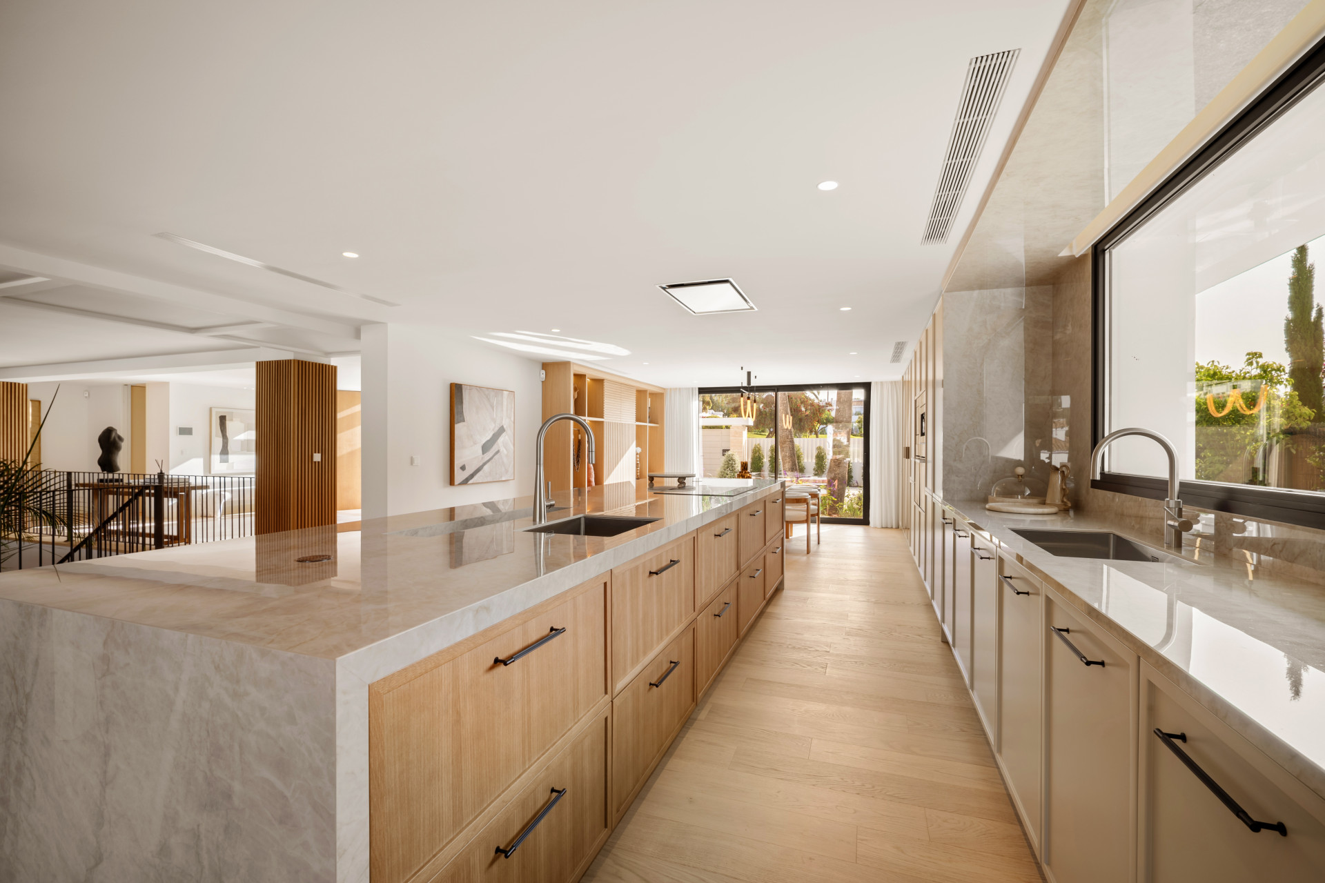 À l’intérieur, la Villa Azteca bénéficie d’un design intérieur raffiné, avec des tons clairs et neutres et des matériaux naturels. Les accents en bois, comme les murs nervurés qui séparent le salon et la cuisine, ajoutent de la chaleur et du caractère. La propriété comprend cinq chambres luxueuses et un impressionnant salon-salle à manger, idéal pour recevoir ou se détendre. La Villa Azteca offre un cadre de vie luxueux sans pareil, avec une vue spectaculaire sur le terrain de golf, unique dans le quartier Aloha de Nueva Andalucía.